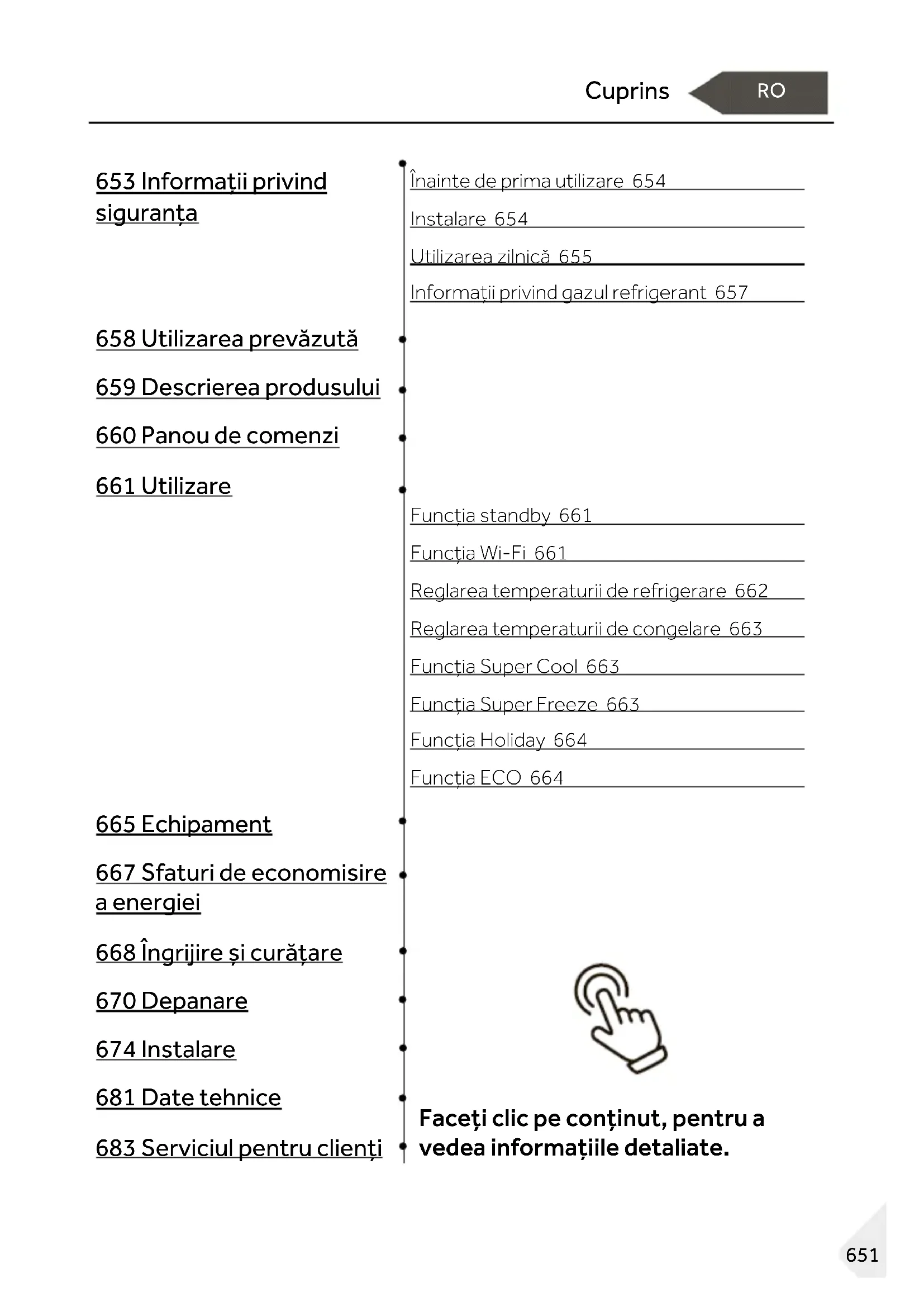 667 Sfaturi de economisire a energiei 668 Îngrijire și curățare 670 Depanare 674 Instalare 681 Date tehnice Faceți clic pe conținut, pentru a vedea informațiile detaliate. 683 Serviciul pentru cliențiVă mulțumim