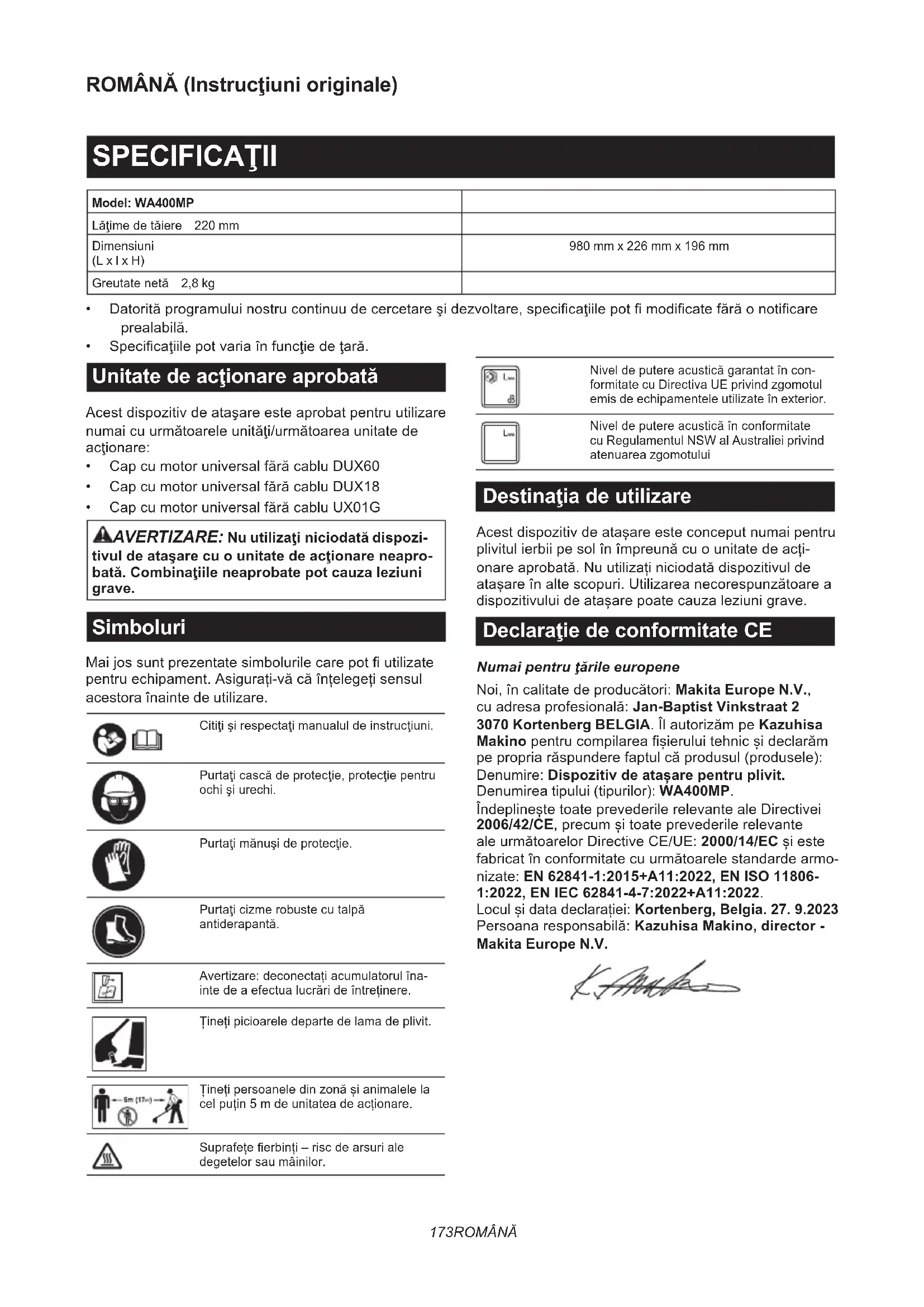 - CapcumotoruniversalfărăcabluUX01G AVERTIZARE: Nu utilizaţi niciodată dispozi- tivul de ataşare cu o unitate de acţionare neapro- bată. Combinaţiile neaprobate pot cauza leziuni grave. Simboluri Maijossuntprezentatesimbolurilecarepotutilizate pentruechipament.Asigurați-văcăînțelegețisensul acestora înainte de utilizare. Citiţişirespectaţimanualuldeinstrucţiuni. Purtaţicascădeprotecţie,protecţiepentru ochişiurechi. Purtaţimănuşideprotecţie. Purtaţicizmerobustecutalpă antiderapantă. Avertizare:deconectațiacumulatorulîna- intedeaefectualucrărideîntreținere. Ținețipicioareledepartedelamadeplivit. Ținețipersoaneledinzonășianimalelela celpuțin5mdeunitateadeacționare. Suprafețeerbinți–riscdearsuriale degetelor sau mâinilor. Niveldeputereacusticăgarantatîncon- formitate cu Directiva UE privind zgomotul emis de echipamentele utilizate în exterior. Niveldeputereacusticăînconformitate cu Regulamentul NSW al Australiei privind atenuarea zgomotului Destinaţia de utilizare Acestdispozitivdeatașareesteconceputnumaipentru plivitulierbiipesolînîmpreunăcuounitatedeacți- onareaprobată.Nuutilizaținiciodatădispozitivulde atașareînaltescopuri.Utilizareanecorespunzătoarea dispozitivuluideatașarepoatecauzaleziunigrave. Declaraţie de conformitate CE Numai pentru ţările europene Noi,încalitatedeproducători:Makita Europe N.V., cuadresaprofesională:Jan-Baptist Vinkstraat 2 3070 Kortenberg BELGIA.ÎlautorizămpeKazuhisa Makinopentrucompilareașieruluitehnicșideclarăm pepropriarăspunderefaptulcăprodusul(produsele): Denumire: Dispozitiv de atașare pentru plivit. Denumirea tipului (tipurilor): WA400MP. ÎndeplineștetoateprevederilerelevantealeDirectivei 2006/42/CE,precumșitoateprevederilerelevante aleurmătoarelorDirectiveCE/UE:2000/14/ECșieste fabricatînconformitatecuurmătoarelestandardearmo- nizate: EN 62841-1:2015+A11:2022, EN ISO 11806- 1:2022, EN IEC 62841-4-7:2022+A11:2022. Loculșidatadeclarației:Kortenberg, Belgia. 27. 9.2023 Persoanaresponsabilă:Kazuhisa Makino, director - Makita Europe N.V.174 ROMÂNĂ