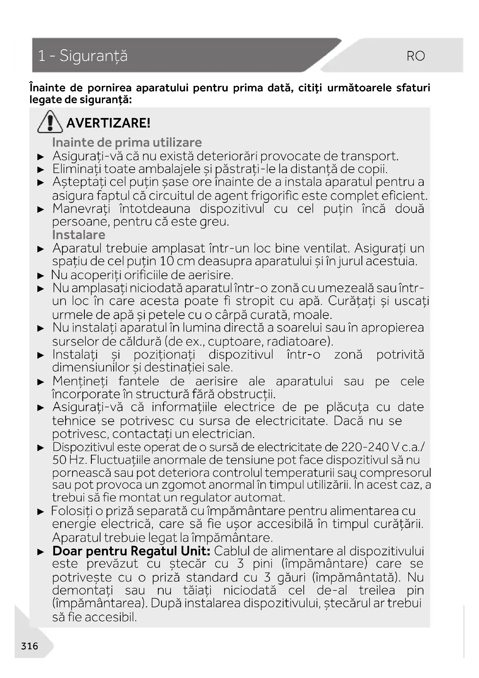 Înainte de pornirea aparatului pentru prima dată, citiți următoarele sfaturi legate de siguranță: AVERTIZARE! Înainte de prima utilizare ► Asigurați-vă că nu există deteriorări provocate de transport. ► Eliminați toate ambalajele și păstrați-le la distanță de copii. ► Așteptați cel puțin șase ore înainte de a instala aparatul pentru a asigura faptul că circuitul de agent frigorific este complet eficient. ► Manevrați întotdeauna dispozitivul cu cel puțin încă două persoane, pentru că este greu. Instalare ► Aparatul trebuie amplasat într-un loc bine ventilat. Asigurați un spațiu de cel puțin 10 cm deasupra aparatului și în jurul acestuia. ► Nu acoperiți orificiile de aerisire. ► Nu amplasați niciodată aparatul într-o zonă cu umezeală sau într- un loc în care acesta poate fi stropit cu apă. Curățați și uscați urmele de apă și petele cu o cârpă curată, moale. ► Nu instalați aparatul în lumina directă a soarelui sau în apropierea surselor de căldură (de ex., cuptoare, radiatoare). ► Instalați și poziționați dispozitivul într-o zonă potrivită dimensiunilor și destinației sale. ► Mențineți fantele de aerisire ale aparatului sau pe cele încorporate în structură fără obstrucții. ► Asigurați-vă că informațiile electrice de pe plăcuța cu date tehnice se potrivesc cu sursa de electricitate. Dacă nu se potrivesc, contactați un electrician. ► Dispozitivul este operat de o sursă de electricitate de 220-240 V c.a./ 50 Hz. Fluctuațiile anormale de tensiune pot face dispozitivul să nu pornească sau pot deteriora controlul temperaturii sau compresorul sau pot provoca un zgomot anormal în timpul utilizării. În acest caz, ar trebui să fie montat un regulator automat. ► Folosiți o priză separată cu împământare pentru alimentarea cu energie electrică, care să fie ușor accesibilă în timpul curățării. Aparatul trebuie legat la împământare. ► Doar pentru Regatul Unit: Cablul de alimentare al dispozitivului este prevăzut cu ștecăr cu 3 pini (împământare) care se potrivește cu o priză standard cu 3 găuri (împământată). Nu demontați sau nu tăiați niciodată cel de-al treilea pin (împământarea). După instalarea dispozitivului, ștecărul ar trebui să fie accesibil.RO