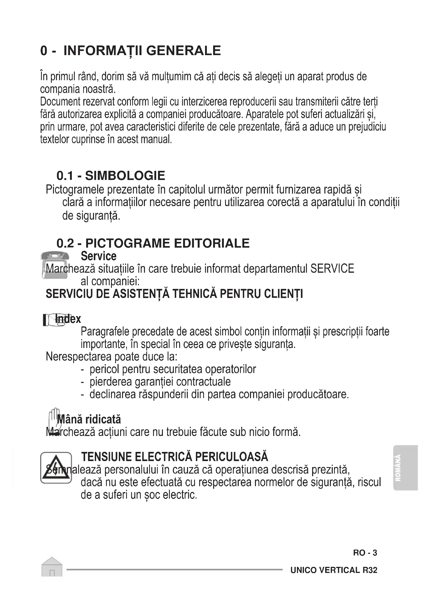 - Indică faptul că informațiile sunt disponibile în manualul de utilizare sau în manualul de instalare. ATENȚIE Indică faptul că personalul responsabil cu asistența trebuie să manipuleze aparatul în conformitate cu manualul de instalare.UNICO VERTICAL R32 RO - 5 ROMÂNĂ