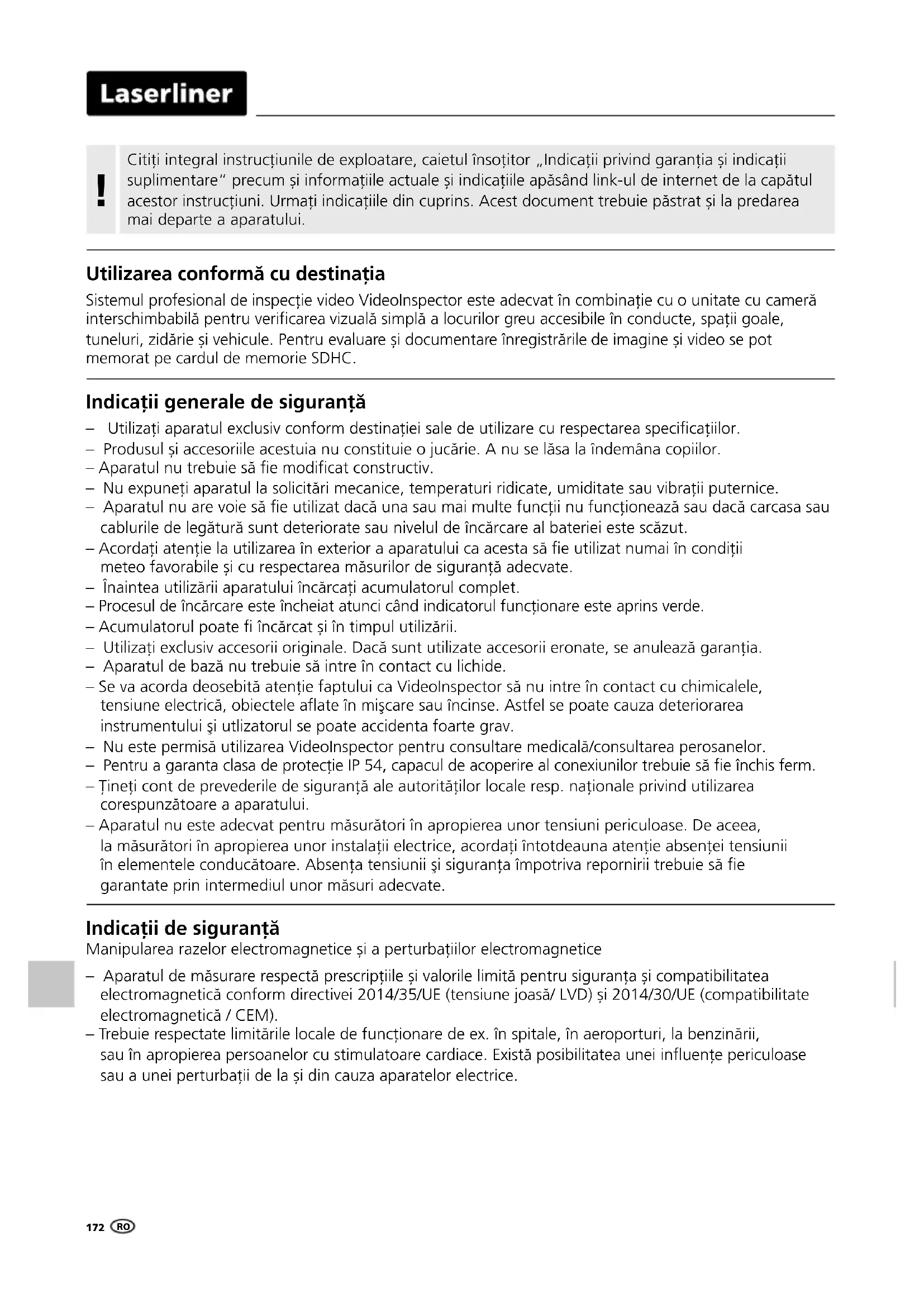 Indicaţii de siguranţă Manipularea razelor electromagnetice și a perturbațiilor electromagnetice – Aparatul de măsurare respectă prescripțiile și valorile limită pentru siguranța și compatibilitatea electromagnetică conform directivei 2014/35/UE (tensiune joasă/ LVD) și 2014/30/UE (compatibilitate electromagnetică / CEM). – Trebuie respectate limitările locale de funcționare de ex. în spitale, în aeroporturi, la benzinării, sau în apropierea persoanelor cu stimulatoare cardiace. Există posibilitatea unei inuențe periculoase sau a unei perturbații de la și din cauza aparatelor electrice. Indicaţii generale de siguranţă – Utilizaţi aparatul exclusiv conform destinaţiei sale de utilizare cu respectarea specicaţiilor. – Produsul și accesoriile acestuia nu constituie o jucărie. A nu se lăsa la îndemâna copiilor. – Aparatul nu trebuie să e modicat constructiv. – Nu expuneţi aparatul la solicitări mecanice, temperaturi ridicate, umiditate sau vibraţii puternice. – Aparatul nu are voie să e utilizat dacă una sau mai multe funcții nu funcționează sau dacă carcasa sau cablurile de legătură sunt deteriorate sau nivelul de încărcare al bateriei este scăzut. – Acordați atenție la utilizarea în exterior a aparatului ca acesta să e utilizat numai în condiții meteo favorabile și cu respectarea măsurilor de siguranță adecvate. – Înaintea utilizării aparatului încărcaţi acumulatorul complet. – Procesul de încărcare este încheiat atunci când indicatorul funcționare este aprins verde. – Acumulatorul poate încărcat și în timpul utilizării. – Utilizați exclusiv accesorii originale. Dacă sunt utilizate accesorii eronate, se anulează garanția. – Aparatul de bază nu trebuie să intre în contact cu lichide. – Se va acorda deosebită atenţie faptului ca VideoInspector să nu intre în contact cu chimicalele, tensiune electrică, obiectele aate în mişcare sau încinse. Astfel se poate cauza deteriorarea instrumentului şi utlizatorul se poate accidenta foarte grav. – Nu este permisă utilizarea VideoInspector pentru consultare medicală/consultarea perosanelor. – Pentru a garanta clasa de protecție IP 54, capacul de acoperire al conexiunilor trebuie să e închis ferm. – Ţineţi cont de prevederile de siguranţă ale autorităţilor locale resp. naţionale privind utilizarea corespunzătoare a aparatului. – Aparatul nu este adecvat pentru măsurători în apropierea unor tensiuni periculoase. De aceea, la măsurători în apropierea unor instalaţii electrice, acordaţi întotdeauna atenţie absenţei tensiunii în elementele conducătoare. Absenţa tensiunii şi siguranţa împotriva repornirii trebuie să e garantate prin intermediul unor măsuri adecvate.RO VideoInspector