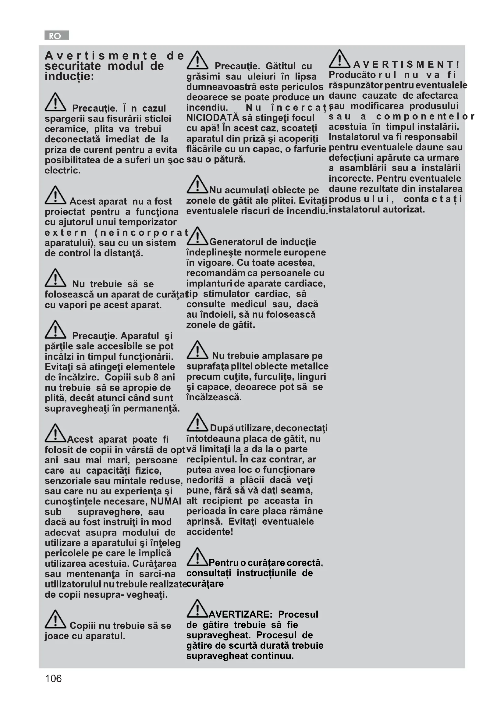 A v e r t i s m e n t e d e securitate modul de inducție: Precauţie. Î n cazul spargerii sau fisurării sticlei ceramice, plita va trebui deconectată imediat de la priza de curent pentru a evita posibilitatea de a suferi un şoc electric. Acest aparat nu a fost proiectat pentru a funcţiona cu ajutorul unui temporizator e x t e r n ( n e î n c o r p o r a t aparatului), sau cu un sistem de control la distanţă. Nu trebuie să se folosească un aparat de curăţat cu vapori pe acest aparat. Precauţie. Aparatul şi părţile sale accesibile se pot încălzi în timpul funcţionării. Evitaţi să atingeţi elementele de încălzire. Copiii sub 8 ani nu trebuie să se apropie de plită, decât atunci când sunt supravegheaţi în permanenţă. Acest aparat poate fi folosit de copii în vârstă de opt ani sau mai mari, persoane care au capacităţi fizice, senzoriale sau mintale reduse, sau care nu au experienţa şi cunoştinţele necesare, NUMAI sub supraveghere, sau dacă au fost instruiţi în mod adecvat asupra modului de utilizare a aparatului şi înţeleg pericolele pe care le implică utilizarea acestuia. Curăţarea sau mentenanţa în sarci-na utilizatorului nu trebuie realizate de copii nesupra- vegheaţi. Copiii nu trebuie să se joace cu aparatul. Precauţie. Gătitul cu grăsimi sau uleiuri în lipsa dumneavoastră este periculos deoarece se poate produce un incendiu. N u î n c e r c a ţ i NICIODATĂ să stingeţi focul cu apă! În acest caz, scoateţi aparatul din priză şi acoperiţi fl ăcările cu un capac, o farfurie sau o pătură. Nu acumulaţi obiecte pe zonele de gătit ale plitei. Evitaţi eventualele riscuri de incendiu. Generatorul de inducţie îndeplineşte normele europene în vigoare. Cu toate acestea, recomandăm ca persoanele cu implanturi de aparate cardiace, tip stimulator cardiac, să consulte medicul sau, dacă au îndoieli, să nu folosească zonele de gătit. Nu trebuie amplasare pe suprafaţa plitei obiecte metalice precum cuţite, furculiţe, linguri şi capace, deoarece pot să se încălzească. După utilizare, deconectaţi întotdeauna placa de gătit, nu vă limitaţi la a da la o parte recipientul. În caz contrar, ar putea avea loc o funcţionare nedorită a plăcii dacă veţi pune, fără să vă daţi seama, alt recipient pe aceasta în perioada în care placa rămâne aprinsă. Evitaţi eventualele accidente! Pentru o curățare corectă, consultați instrucțiunile de curățare AVERTIZARE: Procesul de gătire trebuie să fie supravegheat. Procesul de gătire de scurtă durată trebuie supravegheat continuu. A V E R T I S M E N T ! Producăto r u l n u v a f i răspunzător pentru eventualele daune cauzate de afectarea sau modificarea produsului s a u a c o m p o n e nt e l o r acestuia în timpul instalării. Instalatorul va fi responsabil pentru eventualele daune sau defecțiuni apărute ca urmare a asamblării sau a instalării incorecte. Pentru eventualele daune rezultate din instalarea produs u l u i , conta c t a ț i instalatorul autorizat.107