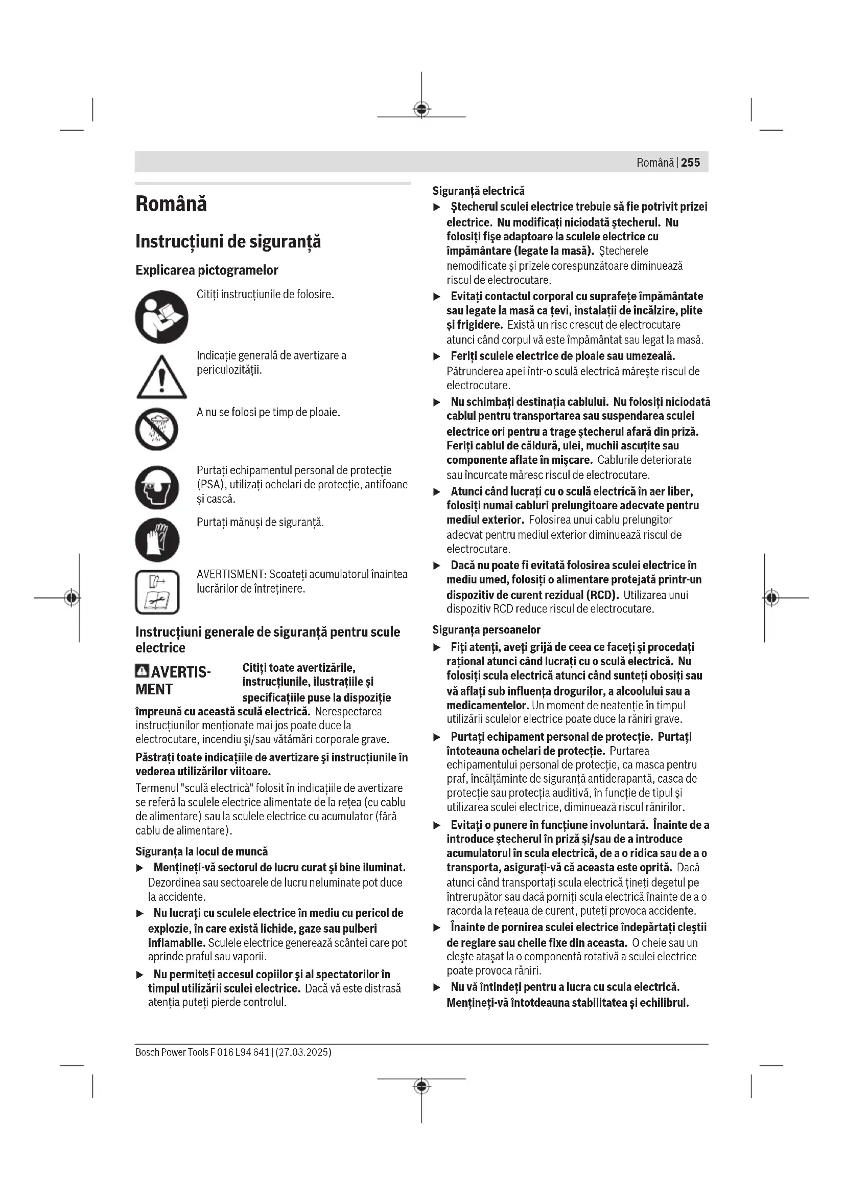 F 016 L94 641 | (27.03.2025) Bosch Power ToolsRomână | 255 Română Instrucţiuni de siguranţă Explicarea pictogramelor Citiţi instrucţiunile de folosire. Indicaţie generală de avertizare a periculozităţii. A nu se folosi pe timp de ploaie. Purtați echipamentul personal de protecție (PSA), utilizați ochelari de protecție, antifoane și cască. Purtați mănuși de siguranță. AVERTISMENT: Scoateți acumulatorul înaintea lucrărilor de întreținere. Instrucţiuni generale de siguranţă pentru scule electrice AVERTIS- MENT Citiţi toate avertizările, instrucţiunile, ilustraţiile şi specificaţiile puse la dispoziţie împreună cu această sculă electrică. Nerespectarea instrucţiunilor menţionate mai jos poate duce la electrocutare, incendiu şi/sau vătămări corporale grave. Păstraţi toate indicaţiile de avertizare şi instrucţiunile în vederea utilizărilor viitoare. Termenul "sculă electrică" folosit în indicaţiile de avertizare se referă la sculele electrice alimentate de la reţea (cu cablu de alimentare) sau la sculele electrice cu acumulator (fără cablu de alimentare). Siguranţa la locul de muncă u Menţineţi‑vă sectorul de lucru curat şi bine iluminat. Dezordinea sau sectoarele de lucru neluminate pot duce la accidente. u Nu lucraţi cu sculele electrice în mediu cu pericol de explozie, în care există lichide, gaze sau pulberi inflamabile. Sculele electrice generează scântei care pot aprinde praful sau vaporii. u Nu permiteţi accesul copiilor şi al spectatorilor în timpul utilizării sculei electrice. Dacă vă este distrasă atenţia puteţi pierde controlul. Siguranţă electrică u Ştecherul sculei electrice trebuie să fie potrivit prizei electrice. Nu modificaţi niciodată ştecherul. Nu folosiţi fişe adaptoare la sculele electrice cu împământare (legate la masă). Ştecherele nemodificate şi prizele corespunzătoare diminuează riscul de electrocutare. u Evitaţi contactul corporal cu suprafeţe împământate sau legate la masă ca ţevi, instalaţii de încălzire, plite şi frigidere. Există un risc crescut de electrocutare atunci când corpul vă este împământat sau legat la masă. u Feriţi sculele electrice de ploaie sau umezeală. Pătrunderea apei într‑o sculă electrică măreşte riscul de electrocutare. u Nu schimbaţi destinaţia cablului. Nu folosiţi niciodată cablul pentru transportarea sau suspendarea sculei electrice ori pentru a trage ştecherul afară din priză. Feriţi cablul de căldură, ulei, muchii ascuţite sau componente aflate în mişcare. Cablurile deteriorate sau încurcate măresc riscul de electrocutare. u Atunci când lucraţi cu o sculă electrică în aer liber, folosiţi numai cabluri prelungitoare adecvate pentru mediul exterior. Folosirea unui cablu prelungitor adecvat pentru mediul exterior diminuează riscul de electrocutare. u Dacă nu poate fi evitată folosirea sculei electrice în mediu umed, folosiţi o alimentare protejată printr-un dispozitiv de curent rezidual (RCD). Utilizarea unui dispozitiv RCD reduce riscul de electrocutare. Siguranţa persoanelor u Fiţi atenţi, aveţi grijă de ceea ce faceţi şi procedaţi raţional atunci când lucraţi cu o sculă electrică. Nu folosiţi scula electrică atunci când sunteţi obosiţi sau vă aflaţi sub influenţa drogurilor, a alcoolului sau a medicamentelor. Un moment de neatenţie în timpul utilizării sculelor electrice poate duce la răniri grave. u Purtaţi echipament personal de protecţie. Purtaţi întoteauna ochelari de protecţie. Purtarea echipamentului personal de protecţie, ca masca pentru praf, încălţăminte de siguranţă antiderapantă, casca de protecţie sau protecţia auditivă, în funcţie de tipul şi utilizarea sculei electrice, diminuează riscul rănirilor. u Evitaţi o punere în funcţiune involuntară. Înainte de a introduce ştecherul în priză şi/sau de a introduce acumulatorul în scula electrică, de a o ridica sau de a o transporta, asiguraţi‑vă că aceasta este oprită. Dacă atunci când transportaţi scula electrică ţineţi degetul pe întrerupător sau dacă porniţi scula electrică înainte de a o racorda la reţeaua de curent, puteţi provoca accidente. u Înainte de pornirea sculei electrice îndepărtaţi cleştii de reglare sau cheile fixe din aceasta. O cheie sau un cleşte ataşat la o componentă rotativă a sculei electrice poate provoca răniri. u Nu vă întindeţi pentru a lucra cu scula electrică. Menţineţi-vă întotdeauna stabilitatea şi echilibrul. Bosch Power Tools F 016 L94 641 | (27.03.2025)256 | Română Astfel veţi putea controla mai bine scula electrică în situaţii neaşteptate. u Purtaţi îmbrăcăminte adecvată. Nu purtaţi îmbrăcăminte largă sau podoabe. Feriţi părul şi îmbrăcămintea de piesele aflate în mişcare. Îmbrăcămintea largă, părul lung sau podoabele pot fi prinse în piesele aflate în mişcare. u Dacă pot fi montate echipamente de aspirare şi colectare a prafului, asiguraţi‑vă că acestea sunt racordate şi folosite în mod corect. Folosirea unei instalaţii de aspirare a prafului poate duce la reducerea poluării cu praf. u Nu vă lăsaţi amăgiţi de uşurinţa în operare dobândită în urma folosirii frecvente a sculelor electrice şi nu ignoraţi principiile de siguranţă ale acestora. Neglijenţa poate provoca, într-o fracţiune de secundă, vătămări corporale grave. Utilizarea şi manevrarea atentă a sculelor electrice u Nu suprasolicitaţi scula electrică. Folosiţi pentru executarea lucrării dv. scula electrică destinată acelui scop. Cu scula electrică potrivită lucraţi mai bine şi mai sigur în domeniul de putere indicat. u Nu folosiţi scula electrică dacă aceasta are întrerupătorul defect. O sculă electrică, care nu mai poate fi pornită sau oprită, este periculoasă şi trebuie reparată. u Scoateţi ştecherul afară din priză şi/sau îndepărtaţi acumu