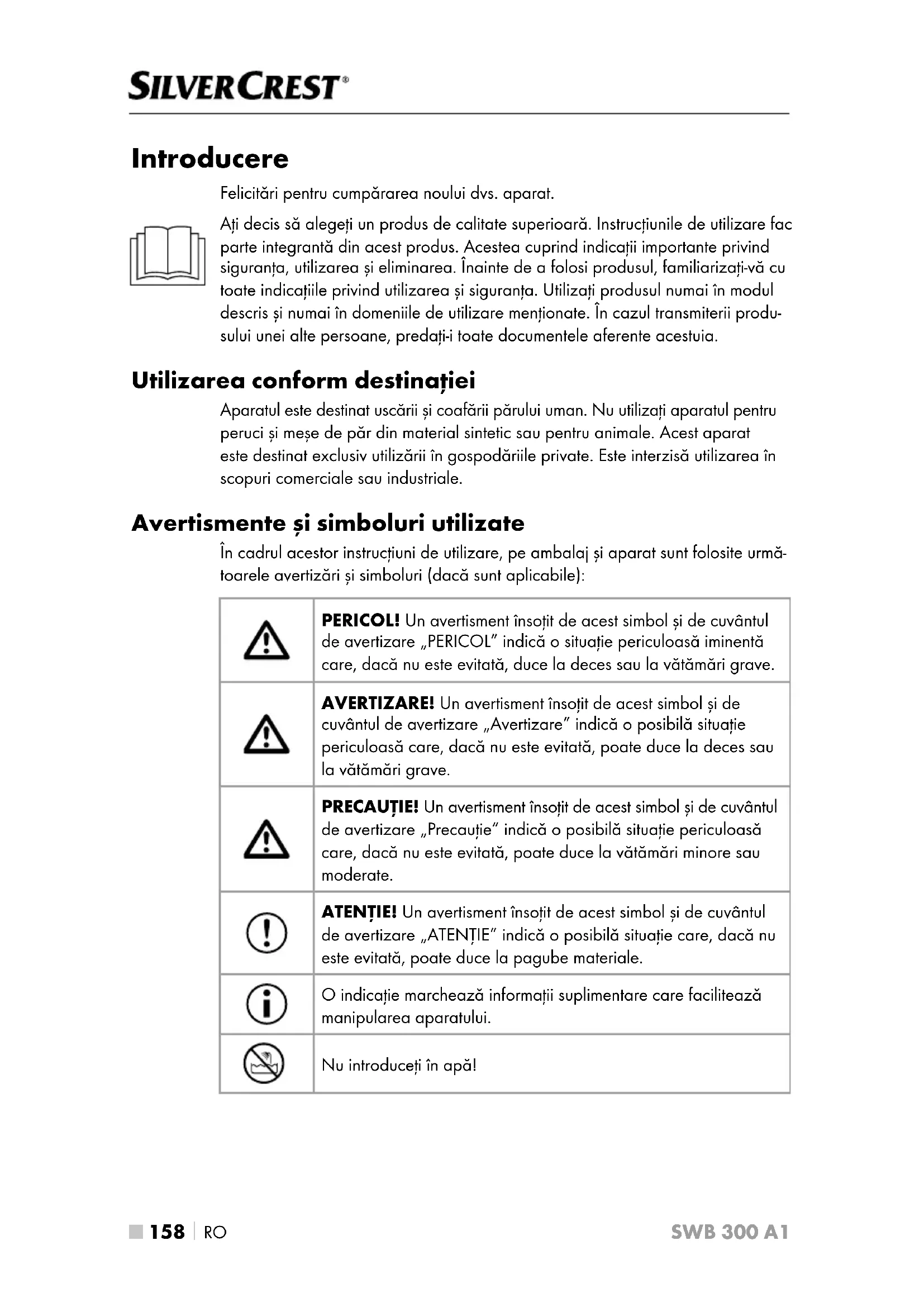SWB 300 A1 Introducere Felicitări pentru cumpărarea noului dvs. aparat. Aţi decis să alegeţi un produs de calitate superioară. Instrucţiunile de utilizare fac parte integrantă din acest produs. Acestea cuprind indicaţii importante privind siguranţa, utilizarea și eliminarea. Înainte de a folosi produsul, familiarizaţi-vă cu toate indicaţiile privind utilizarea și siguranţa. Utilizaţi produsul numai în modul descris și numai în domeniile de utilizare menţionate. În cazul transmiterii produ- sului unei alte persoane, predaţi-i toate documentele aferente acestuia. Utilizarea conform destinaţiei Aparatul este destinat uscării și coafării părului uman. Nu utilizaţi aparatul pentru peruci și meșe de păr din material sintetic sau pentru animale. Acest aparat este destinat exclusiv utilizării în gospodăriile private. Este interzisă utilizarea în scopuri comerciale sau industriale. Avertismente și simboluri utilizate În cadrul acestor instrucţiuni de utilizare, pe ambalaj și aparat sunt folosite urmă- toarele avertizări și simboluri (dacă sunt aplicabile): PERICOL! Un avertisment însoţit de acest simbol și de cuvântul de avertizare „PERICOL” indică o situaţie periculoasă iminentă care, dacă nu este evitată, duce la deces sau la vătămări grave. AVERTIZARE! Un avertisment însoţit de acest simbol și de cuvântul de avertizare „Avertizare” indică o posibilă situaţie periculoasă care, dacă nu este evitată, poate duce la deces sau la vătămări grave. PRECAUŢIE! Un avertisment însoţit de acest simbol și de cuvântul de avertizare „Precauţie” indică o posibilă situaţie periculoasă care, dacă nu este evitată, poate duce la vătămări minore sau moderate. ATENŢIE! Un avertisment însoţit de acest simbol și de cuvântul de avertizare „ATENŢIE” indică o posibilă situaţie care, dacă nu este evitată, poate duce la pagube materiale. O indicaţie marchează informaţii suplimentare care facilitează manipularea aparatului. Nu introduceţi în apă!RO