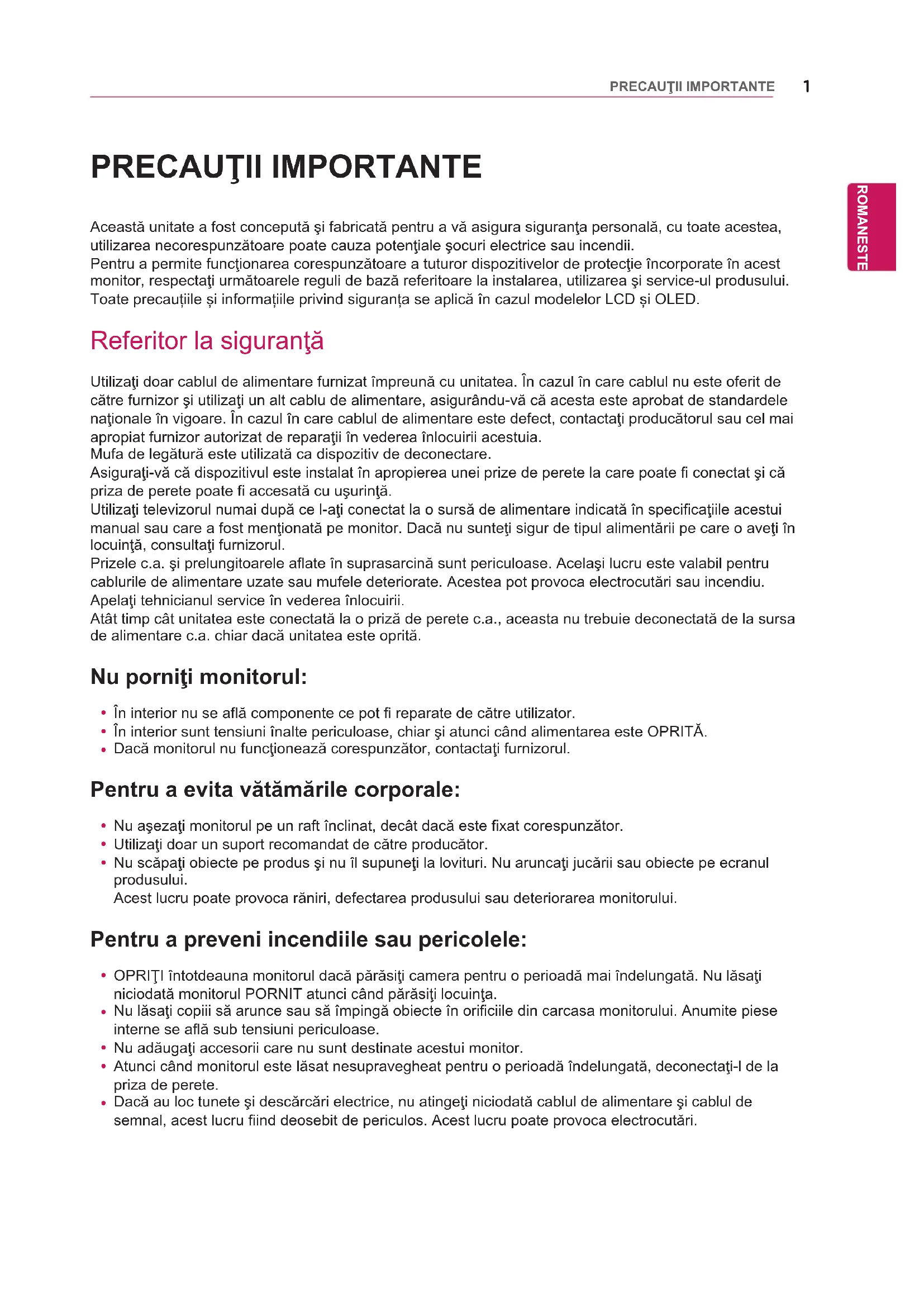 ÁGUA ÁGua QuÍmicos1 ENG ROMANESTE Această unitate a fost concepută şi fabricată pentru a vă asigura siguranţa personală, cu toate acestea, utilizarea necorespunzătoare poate cauza potenţiale şocuri electrice sau incendii.Pentru a permite funcţionarea corespunzătoare a tuturor dispozitivelor de protecţie încorporate în acest monitor, respectaţi următoarele reguli de bază referitoare la instalarea, utilizarea şi service-ul produsului. Toate precauțiile și informațiile privind siguranța se aplică în cazul modelelor LCD și OLED. Referitor la siguranţă Utilizaţi doar cablul de alimentare furnizat împreună cu unitatea. În cazul în care cablul nu este oferit de către furnizor şi utilizaţi un alt cablu de alimentare, asigurându-vă că acesta este aprobat de standardele naţionale în vigoare. În cazul în care cablul de alimentare este defect, contactaţi producătorul sau cel mai apropiat furnizor autorizat de reparaţii în vederea înlocuirii acestuia.Mufa de legătură este utilizată ca dispozitiv de deconectare. Asiguraţi-vă că dispozitivul este instalat în apropierea unei prize de perete la care poate fi conectat şi că priza de perete poate fi accesată cu uşurinţă.Utilizaţi televizorul numai după ce l-aţi conectat la o sursă de alimentare indicată în specificaţiile acestui manual sau care a fost menţionată pe monitor. Dacă nu sunteţi sigur de tipul alimentării pe care o aveţi în locuinţă, consultaţi furnizorul.Prizele c.a. şi prelungitoarele aflate în suprasarcină sunt periculoase. Acelaşi lucru este valabil pentru cablurile de alimentare uzate sau mufele deteriorate. Acestea pot provoca electrocutări sau incendiu.Apelaţi tehnicianul service în vederea înlocuirii.Atât timp cât unitatea este conectată la o priză de perete c.a., aceasta nu trebuie deconectată de la sursa de alimentare c.a. chiar dacă unitatea este oprită.