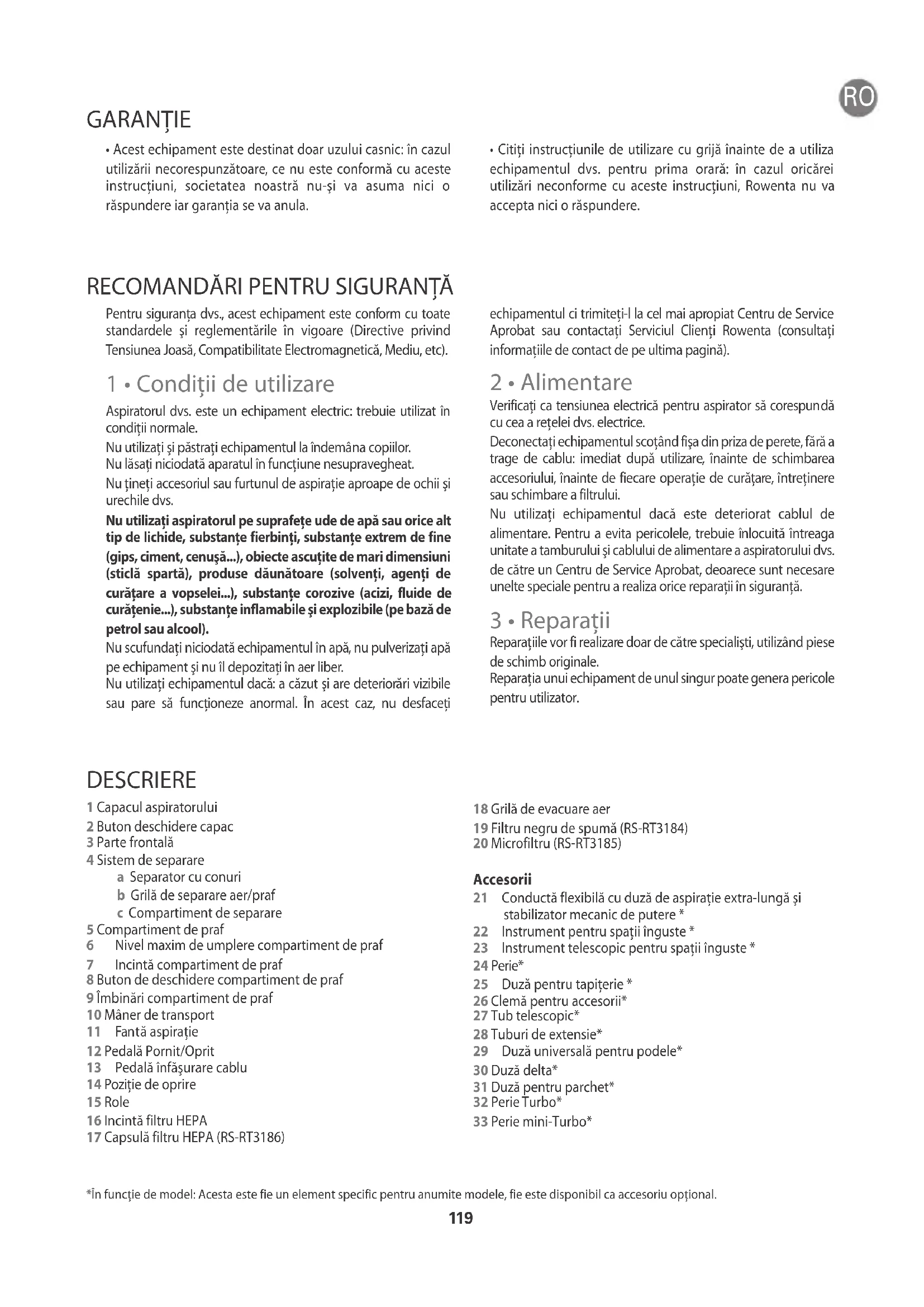 *Ovisno o modelu: Svaki pribor dolazi uz određeni model usisivača ili se nastavak/ pribor naknadno može kupiti u ovlaštenom Rowenta servisu. OKOLIŠ119 Pentru siguranţa dvs., acest echipament este conform cu toate standardele şi reglementările în vigoare (Directive privind Tensiunea Joasă, Compatibilitate Electromagnetică, Mediu, etc). 1 • Condiţii de utilizare Aspiratorul dvs. este un echipament electric: trebuie utilizat în condiţii normale. Nu utilizaţi şi păstraţi echipamentul la îndemâna copiilor. Nu lăsaţi niciodată aparatul în funcţiune nesupravegheat. Nu ţineţi accesoriul sau furtunul de aspiraţie aproape de ochii şi urechile dvs. Nu utilizaţi aspiratorul pe suprafeţe ude de apă sau orice alt tip de lichide, substanţe fierbinţi, substanţe extrem de fine (gips, ciment, cenuşă...), obiecte ascuţite de mari dimensiuni (sticlă spartă), produse dăunătoare (solvenţi, agenţi de curăţare a vopselei...), substanţe corozive (acizi, fluide de curăţenie...), substanţe inflamabile şi explozibile (pe bază de petrol sau alcool). Nu scufundaţi niciodată echipamentul în apă, nu pulverizaţi apă pe echipament şi nu îl depozitaţi în aer liber. Nu utilizaţi echipamentul dacă: a căzut şi are deteriorări vizibile sau pare să funcţioneze anormal. În acest caz, nu desfaceţi echipamentul ci trimiteţi-l la cel mai apropiat Centru de Service Aprobat sau contactaţi Serviciul Clienţi Rowenta (consultaţi informaţiile de contact de pe ultima pagină). 2 • Alimentare Verificaţi ca tensiunea electrică pentru aspirator să corespundă cu cea a reţelei dvs. electrice. Deconectaţi echipamentul scoţând fişa din priza de perete, fără a trage de cablu: imediat după utilizare, înainte de schimbarea accesoriului, înainte de fiecare operaţie de curăţare, întreţinere sau schimbare a filtrului. Nu utilizaţi echipamentul dacă este deteriorat cablul de alimentare. Pentru a evita pericolele, trebuie înlocuită întreaga unitate a tamburului şi cablului de alimentare a aspiratorului dvs. de către un Centru de Service Aprobat, deoarece sunt necesare unelte speciale pentru a realiza orice reparaţii în siguranţă. 3 • Reparaţii Reparaţiile vor fi realizare doar de către specialişti, utilizând piese de schimb originale. Reparaţia unui echipament de unul singur poate genera pericole pentru utilizator. DESCRIERE 1 Capacul aspiratorului 2 Buton deschidere capac 3 Parte frontală 4 Sistem de separare a Separator cu conuri b Grilă de separare aer/praf c Compartiment de separare 5 Compartiment de praf 6 Nivel maxim de umplere compartiment de praf 7 Incintă compartiment de praf 8 Buton de deschidere compartiment de praf 9 Îmbinări compartiment de praf 10 Mâner de transport 11 Fantă aspiraţie 12 Pedală Pornit/Oprit 13 Pedală înfăşurare cablu 14 Poziţie de oprire 15 Role 16 Incintă filtru HEPA 17 Capsulă filtru HEPA (RS-RT3186) 18 Grilă de evacuare aer 19 Filtru negru de spumă (RS-RT3184) 20 Microfiltru (RS-RT3185) Accesorii 21 Conductă flexibilă cu duză de aspiraţie extra-lungă şi stabilizator mecanic de putere * 22 Instrument pentru spaţii înguste * 23 Instrument telescopic pentru spaţii înguste * 24 Perie* 25 Duză pentru tapiţerie * 26 Clemă pentru accesorii* 27 Tub telescopic* 28 Tuburi de extensie* 29 Duză universală pentru podele* 30 Duză delta* 31 Duză pentru parchet* 32 Perie Turbo* 33 Perie mini-Turbo* *În funcţie de model: Acesta este fie un element specific pentru anumite modele, fie este disponibil ca accesoriu opţional.