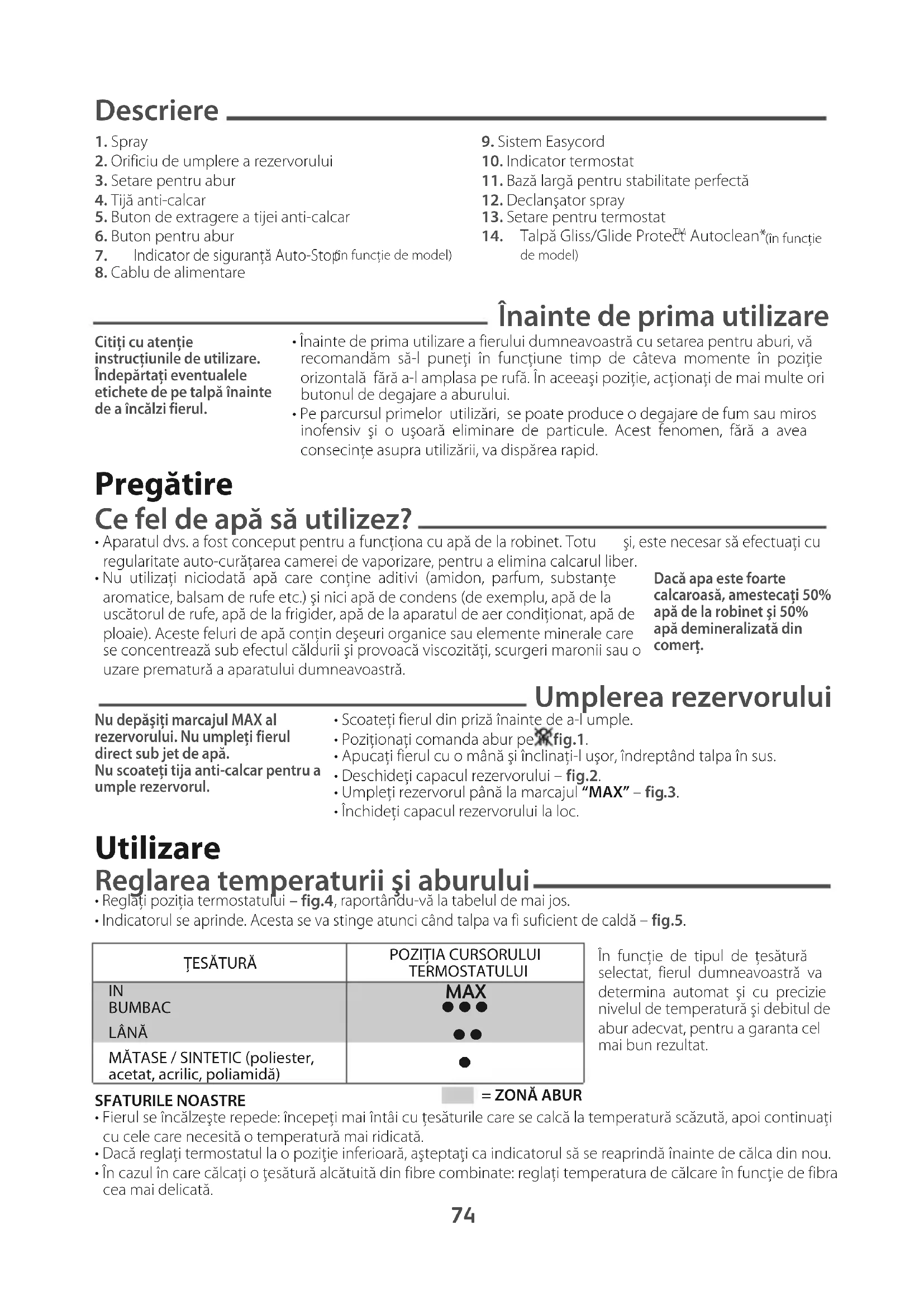 - Reglaţi temperatura în funcţie de materialul călcat.• Setaţi aburul pe – fig.1.• Puteţi călca atunci când indicatorul se stinge. Funcţii suplimentare Talpă Gliss/Glide Protect
