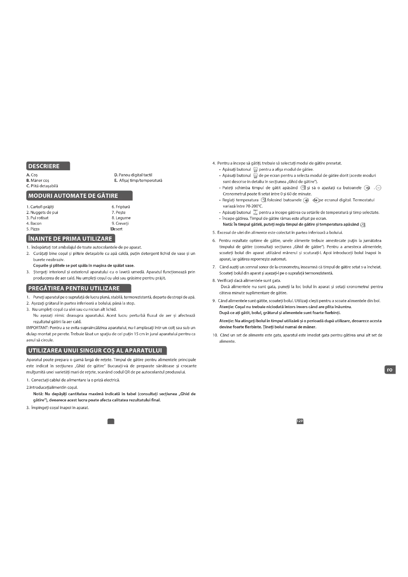 DESCRIERE A. Coș B. Mâner coș C. Plită detașabilă D. Panou digital tactil E. Afișaj timp/temperatură