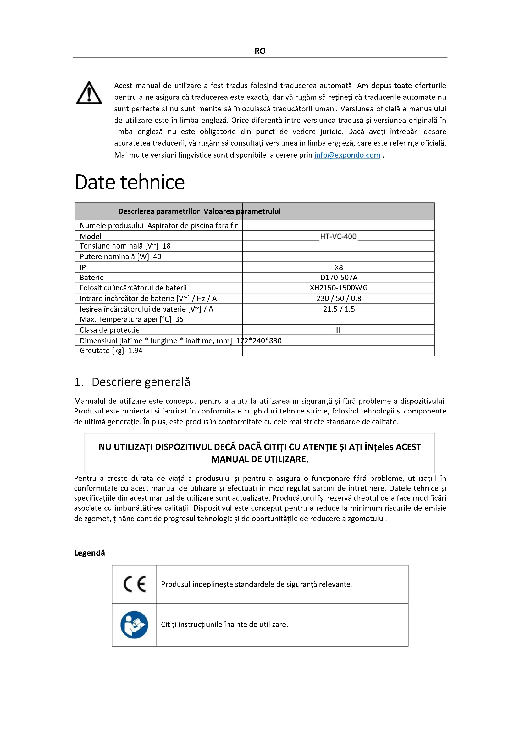 Manualul de utilizare este conceput pentru a ajuta la utilizarea în siguranță și fără probleme a dispozitivului. Produsul este proiectat și fabricat în conformitate cu ghiduri tehnice stricte, folosind tehnologii și componente de ultimă generație. În plus, este produs în conformitate cu cele mai stricte standarde de calitate. NU UTILIZAȚI DISPOZITIVUL DECĂ DACĂ CITIȚI CU ATENȚIE ȘI AȚI ÎNțeles ACEST MANUAL DE UTILIZARE. Pentru a crește durata de viață a produsului și pentru a asigura o funcționare fără probleme, utilizați-l în conformitate cu acest manual de utilizare și efectuați în mod regulat sarcini de întreținere. Datele tehnice și specificațiile din acest manual de utilizare sunt actualizate. Producătorul își rezervă dreptul de a face modificări asociate cu îmbunătățirea calității. Dispozitivul este conceput pentru a reduce la minimum riscurile de emisie de zgomot, ținând cont de progresul tehnologic și de oportunitățile de reducere a zgomotului. Legendă Produsul îndeplinește standardele de siguranță relevante. Citiți instrucțiunile înainte de utilizare.RO Produsul trebuie reciclat. AVERTIZARE! sau ATENȚIE! sau ȚINE minte! Aplicabil la situația dată. (semn general de avertizare) ATENȚIE! Avertisment de electrocutare! ATENŢIE! Citiți toate avertismentele de siguranță și toate instrucțiunile. Nerespectarea avertismentelor și instrucțiunilor poate duce la șoc electric, incendiu și/sau vătămare gravă sau chiar deces. Termenii „dispozitiv” sau „produs” sunt utilizați în avertismente și instrucțiuni pentru a se referi la: Aspirator de piscina fara fir 1.1. Siguranta electrica a) Ștecherul trebuie să se potrivească în priză. Nu modificați ștecherul în niciun fel. Utilizarea ștecherelor originale și a prizelor potrivite reduce riscul de electrocutare. b) Evitați atingerea elementelor legate la pământ, cum ar fi țevi, încălzitoare, cazane și frigidere. Există un risc crescut de electrocutare dacă dispozitivul cu împământare este expus ploii, intră în contact direct cu o suprafață umedă sau funcționează într-un mediu umed. Pătrunderea apei în dispozitiv crește riscul de deteriorare a dispozitivului și de electrocutare. c) Nu atingeți dispozitivul cu mâinile ude sau umede când este conectat la încărcător. d) Utilizați cablul numai pentru utilizarea specificată. Nu îl utilizați niciodată pentru a transporta dispozitivul sau pentru a scoate ștecherul dintr-o priză. Țineți cablul departe de surse de căldură, ulei, margini ascuțite sau părți în mișcare. Cablurile deteriorate sau încurcate cresc riscul de electrocutare. e) Întrerupeți utilizarea dacă cablul de alimentare sau adaptorul este deteriorat sau prezintă semne de uzură. O sursă de alimentare deteriorată trebuie înlocuită. Un cablu de alimentare deteriorat trebuie înlocuit de un electrician calificat sau de un centru de service al producătorului. f) Nu utilizați produsul atunci când sunt oameni în apă. g) La încărcare, asigurați-vă că aparatul este conectat la o priză într-un loc unde nu există riscul de inundare și care este protejat împotriva umezelii. h) Opriți produsul înainte de încărcare.