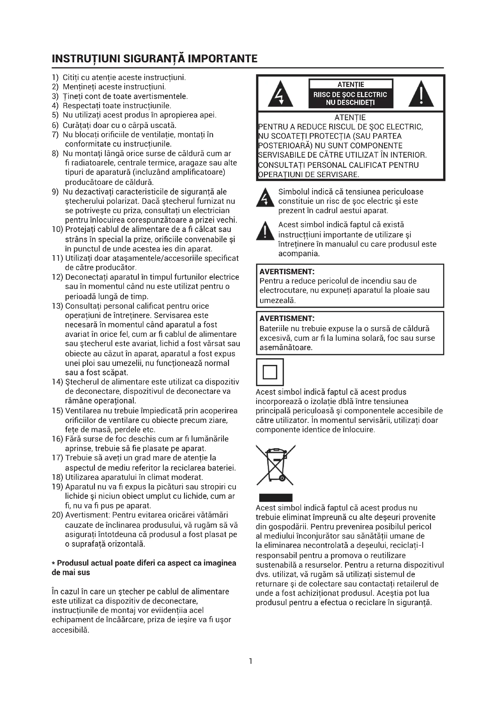 OPERAŢIUNI DE SERVISARE. Simbolul indică că tensiunea periculoase constituie un risc de şoc electric şi este prezent în cadrul aestui aparat. Acest simbol indică faptul că există instrucţţiuni importante de utilizare şi întreţinere în manualul cu care produsul este acompania. AVERTISMENT: Pentru a reduce pericolul de incendiu sau de electrocutare, nu expuneţi aparatul la ploaie sau umezeală. AVERTISMENT: Bateriile nu trebuie expuse la o sursă de căldură excesivă, cum ar la lumina solară, foc sau surse asemănătoare. Acest simbol indică faptul că acest produs incorporează o izolaţie dblă între tensiunea principală periculoasă şi componentele accesibile de către utilizator. În momentul servisării, utilizaţi doar componente identice de înlocuire. Acest simbol indică faptul că acest produs nu trebuie eliminat împreună cu alte deşeuri provenite din gospodării. Pentru prevenirea posibilul pericol al mediului înconjurător sau sănătăţii umane de la eliminarea necontrolată a deşeului, reciclaţi-l responsabil pentru a promova o reutilizare sustenabilă a resurselor. Pentru a returna dispozitivul dvs. utilizat, vă rugăm să utilizaţi sistemul de returnare şi de colectare sau contactaţi retailerul de unde a fost achiziţionat produsul. Aceştia pot lua produsul pentru a efectua o reciclare în siguranţă.2