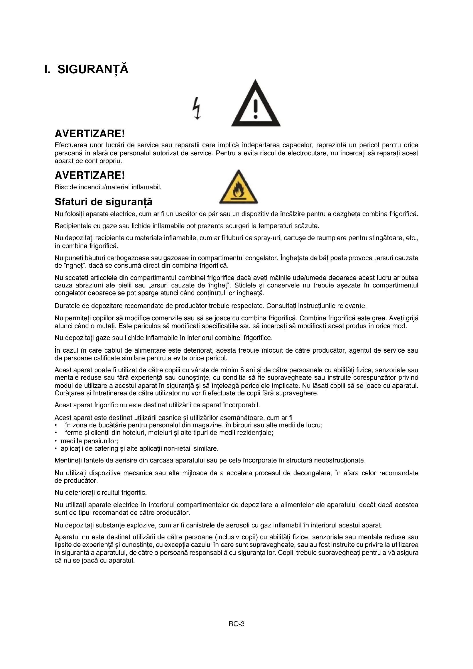 Risc de incendiu/material inflamabil. Sfaturi de siguranță Nu folosiți aparate electrice, cum ar fi un uscător de păr sau un dispozitiv de încălzire pentru a dezgheța combina frigorifică. Recipientele cu gaze sau lichide inflamabile pot prezenta scurgeri la temperaturi scăzute. Nu depozitați recipiente cu materiale inflamabile, cum ar fi tuburi de spray-uri, cartușe de reumplere pentru stingătoare, etc., în combina frigorifică. Nu puneți băuturi carbogazoase sau gazoase în compartimentul congelator. Înghețata de băț poate provoca „arsuri cauzate de îngheț”. dacă se consumă direct din combina frigorifică. Nu scoateți articolele din compartimentul combinei frigorifice dacă aveți mâinile ude/umede deoarece acest lucru ar putea cauza abraziuni ale pielii sau „arsuri cauzate de îngheț”. Sticlele și conservele nu trebuie așezate în compartimentul congelator deoarece se pot sparge atunci când conținutul lor îngheață. Duratele de depozitare recomandate de producător trebuie respectate. Consultați instrucțiunile relevante. Nu permiteți copiilor să modifice comenzile sau să se joace cu combina frigorifică. Combina frigorifică este grea. Aveți grijă atunci când o mutați. Este periculos să modificați specificațiile sau să încercați să modificați acest produs în orice mod. Nu depozitați gaze sau lichide inflamabile în interiorul combinei frigorifice. În cazul în care cablul de alimentare este deteriorat, acesta trebuie înlocuit de către producător, agentul de service sau de persoane calificate similare pentru a evita orice pericol. Acest aparat poate fi utilizat de către copiii cu vârste de minim 8 ani și de către persoanele cu abilități fizice, senzoriale sau mentale reduse sau fără experiență sau cunoștințe, cu condiția să fie supravegheate sau instruite corespunzător privind modul de utilizare a acestui aparat în siguranță și să înțeleagă pericolele implicate. Nu lăsați copiii să se joace cu aparatul. Curățarea și întreținerea de către utilizator nu vor fi efectuate de copii fără supraveghere. Acest aparat frigorific nu este destinat utilizării ca aparat încorporabil. Acest aparat este destinat utilizării casnice și utilizărilor asemănătoare, cum ar fi