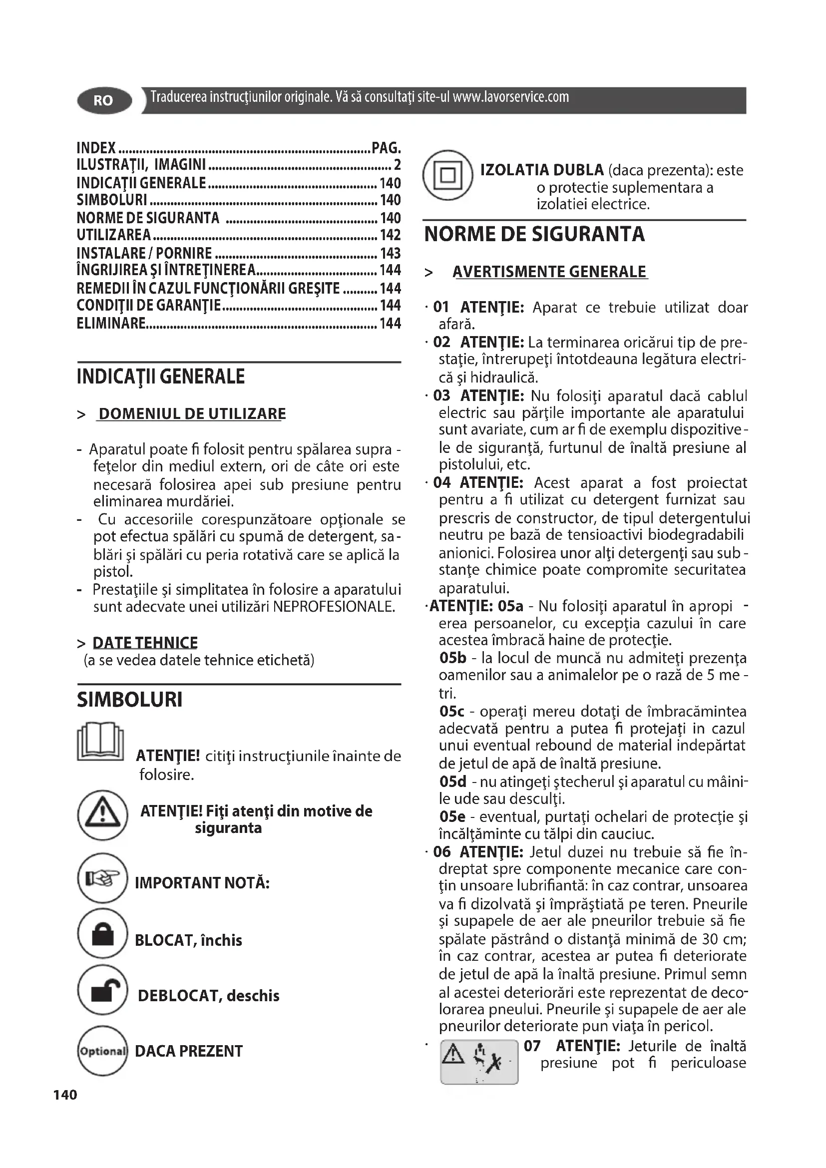 blări şi spălări cu peria rotativă care se aplică la pistol. - Prestaţiile şi simplitatea în folosire a aparatului sunt adecvate unei utilizări NEPROFESIONALE. > DATE TEHNICE (a se vedea datele tehnice etichetă) SIMBOLURI ATENŢIE! citiţi instrucţiunile înainte de folosire. ATENŢIE! Fiţi atenţi din motive de siguranta IMPORTANT NOTĂ: BLOCAT, închis DEBLOCAT, deschis DACA PREZENT IZOLATIA DUBLA (daca prezenta): este o protectie suplementara a izolatiei electrice.