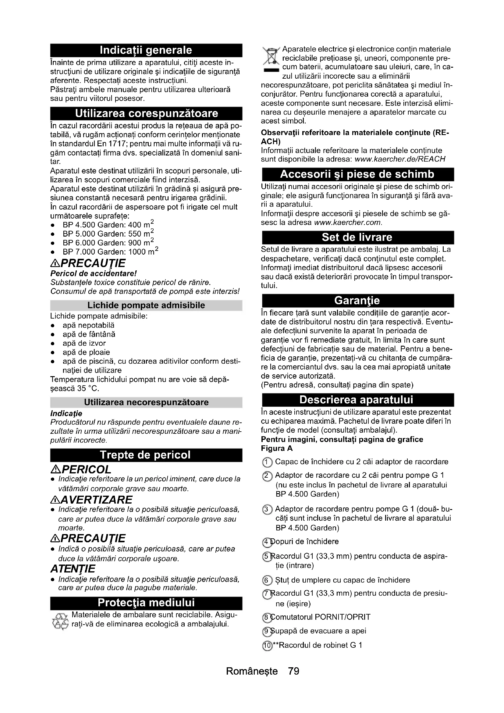 몇 PRECAUŢIE Pericol de accidentare! Substanțele toxice constituie pericol de rănire. Consumul de apă transportată de pompă este interzis! Lichide pompate admisibile Lichide pompate admisibile: ● apă nepotabilă ● apă de fântână ● apă de izvor ● apă de ploaie ● apă de piscină, cu dozarea aditivilor conform desti- naţiei de utilizare Temperatura lichidului pompat nu are voie să depă- şească 35 °C. Utilizarea necorespunzătoare Indicaţie Producătorul nu răspunde pentru eventualele daune re- zultate în urma utilizării necorespunzătoare sau a mani- pulării incorecte. Trepte de pericol PERICOL ● Indicaţie referitoare la un pericol iminent, care duce la vătămări corporale grave sau moarte. 몇 AVERTIZARE ● Indicaţie referitoare la o posibilă situaţie periculoasă, care ar putea duce la vătămări corporale grave sau moarte. 몇 PRECAUŢIE ● Indică o posibilă situaţie periculoasă, care ar putea duce la vătămări corporale uşoare. ATENŢIE ● Indicaţie referitoare la o posibilă situaţie periculoasă, care ar putea duce la pagube materiale. Protecţia mediului Materialele de ambalare sunt reciclabile. Asigu- rați-vă de eliminarea ecologică a ambalajului. Aparatele electrice şi electronice conțin materiale reciclabile prețioase şi, uneori, componente pre- cum baterii, acumulatoare sau uleiuri, care, în ca- zul utilizării incorecte sau a eliminării necorespunzătoare, pot periclita sănătatea şi mediul în- conjurător. Pentru funcţionarea corectă a aparatului, aceste componente sunt necesare. Este interzisă elimi- narea cu deșeurile menajere a aparatelor marcate cu acest simbol. Observaţii referitoare la materialele conţinute (RE- ACH) Informații actuale referitoare la materialele conținute sunt disponibile la adresa: www.kaercher.de/REACH Accesorii şi piese de schimb Utilizaţi numai accesorii originale şi piese de schimb ori- ginale; ele asigură funcţionarea în siguranţă şi fără ava- rii a aparatului. Informaţii despre accesorii şi piesele de schimb se gă- sesc la adresa www.kaercher.com. Set de livrare Setul de livrare a aparatului este ilustrat pe ambalaj. La despachetare, verificaţi dacă conţinutul este complet. Informaţi imediat distribuitorul dacă lipsesc accesorii sau dacă există deteriorări provocate în timpul transpor- tului. Garanţie În fiecare țară sunt valabile condițiile de garanție acor- date de distribuitorul nostru din țara respectivă. Eventu- ale defecțiuni survenite la aparat în perioada de garanție vor fi remediate gratuit, în limita în care sunt defecțiuni de fabricație sau de material. Pentru a bene- ficia de garanție, prezentați-vă cu chitanța de cumpăra- re la comerciantul dvs. sau la cea mai apropiată unitate de service autorizată. (Pentru adresă, consultați pagina din spate) Descrierea aparatului În aceste instrucţiuni de utilizare aparatul este prezentat cu echiparea maximă. Pachetul de livrare poate diferi în funcţie de model (consultaţi ambalajul). Pentru imagini, consultați pagina de grafice Figura A 1 Capac de închidere cu 2 căi adaptor de racordare 2 Adaptor de racordare cu 2 căi pentru pompe G 1 (nu este inclus în pachetul de livrare al aparatului BP 4.500 Garden) 3 Adaptor de racordare pentru pompe G 1 (două- bu- căți sunt incluse în pachetul de livrare al aparatului BP 4.500 Garden) 4 Dopuri de închidere 5 Racordul G1 (33,3 mm) pentru conducta de aspira- ție (intrare) 6 Ștuț de umplere cu capac de închidere 7 Racordul G1 (33,3 mm) pentru conducta de presiu- ne (ieșire) 8 Comutatorul PORNIT/OPRIT 9 Supapă de evacuare a apei 10 **Racordul de robinet G 180 Româneşte 11 **Cuplaj cu Aqua Stop 12 **Cuplaj 13 **Pulverizator 14 *Set de furtunuri de aspirație, inclusiv furtun spiralat de 3,5 m, gata de conectare, rezistent la vid, cu filtru de aspirație și opritor de reflux 15 **Furtun de grădină de 1/2″ 20 m 16 Cablu de racord la reţea cu ştecăr