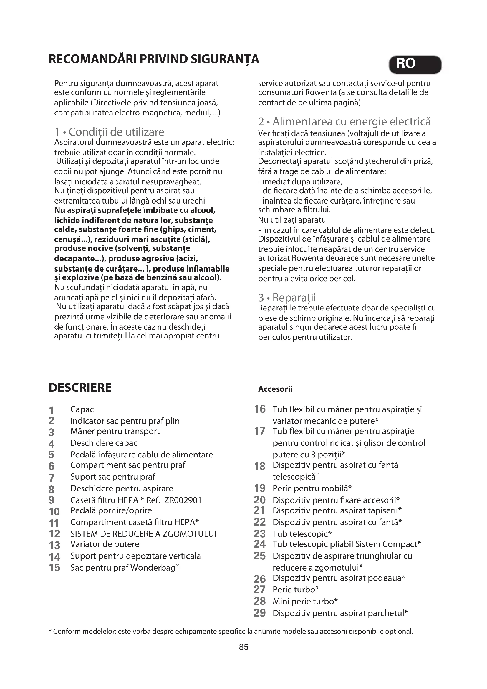 TARTOZÉKOK* RENDELTETÉS HASZNÁLAT BESZERZÉSI Wonderbag zsák Kárpitkefe Kárpithoz való fej Teleszkópos résszívót Parkettatisztító fej Mini turbókefe Turbókefe A bútorok tisztítására. A bútorok tisztítására. A rejtett és nehezen elérhető helyek tisztítására. Az érzékeny talajokhoz. A bútorszövetek alapos megtisztítására. A kárpitra és mokettára tapadt állat szőr eltávolítására. Univerzális zsák. Helyezze a kárpitkefét a markolat vagy a cső végére. Illessze a bútorszívót a nyél vagy a cső végével. Illessze össze a teleszkópos résszívót a nyéllel vagy a csővel Illessze össze a cső végén lévő parkettaszívót. Illessze össze a cső végén lévő mini turbókefét. Illessze össze a cső végén lévő turbókefét. Illessze a gyűrűt a Wonderbag zsákra, beteheti a rekesz belsejébe. Rowenta hivatalos javítóközpontok. (lásd amellékelt címek listáját)85Pentru siguranţa dumneavoastră, acest aparat este conform cu normele şi reglementările aplicabile (Directivele privind tensiunea joasă, compatibilitatea electro-magnetică, mediul, ...) 1 • Condiţii de utilizare Aspiratorul dumneavoastră este un aparat electric: trebuie utilizat doar în condiţii normale. Utilizaţi şi depozitaţi aparatul într-un loc unde copii nu pot ajunge. Atunci când este pornit nu lăsaţi niciodată aparatul nesupravegheat.Nu ţineţi dispozitivul pentru aspirat sau extremitatea tubului lângă ochi sau urechi.Nu aspiraţi suprafeţele îmbibate cu alcool, lichide indiferent de natura lor, substanţe calde, substanţe foarte ne (ghips, ciment, cenuşă...), reziduuri mari ascuţite (sticlă), produse nocive (solvenţi, substanţe decapante...), produse agresive (acizi, substanţe de curăţare... ), produse inamabile şi explozive (pe bază de benzină sau alcool).Nu scufundaţi niciodată aparatul în apă, nu aruncaţi apă pe el şi nici nu îl depozitaţi afară. Nu utilizaţi aparatul dacă a fost scăpat jos şi dacă prezintă urme vizibile de deteriorare sau anomalii de funcţionare. În aceste caz nu deschideţi aparatul ci trimiteţi-l la cel mai apropiat centru service autorizat sau contactaţi service-ul pentru consumatori Rowenta (a se consulta detaliile de contact de pe ultima pagină) 2 • Alimentarea cu energie electrică Vericaţi dacă tensiunea (voltajul) de utilizare a aspiratorului dumneavoastră corespunde cu cea a instalaţiei electrice.Deconectaţi aparatul scoţând ştecherul din priză, fără a trage de cablul de alimentare:- imediat după utilizare,- de ecare dată înainte de a schimba accesoriile,- înaintea de ecare curăţare, întreţinere sau schimbare a ltrului.Nu utilizaţi aparatul:- în cazul în care cablul de alimentare este defect. Dispozitivul de înfăşurare şi cablul de alimentare trebuie înlocuite neapărat de un centru service autorizat Rowenta deoarece sunt necesare unelte speciale pentru efectuarea tuturor reparaţiilor pentru a evita orice pericol. 3 • Reparaţii Reparaţiile trebuie efectuate doar de specialişti cu piese de schimb originale. Nu încercaţi să reparaţi aparatul singur deoarece acest lucru poate periculos pentru utilizator.