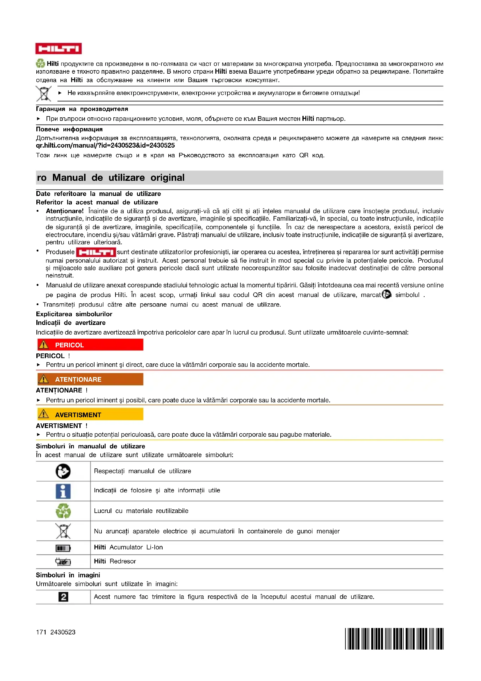 - Manualul de utilizare anexat corespunde stadiului tehnologic actual la momentul tipăririi. Găsiți întotdeauna cea mai recentă versiune online pe pagina de produs Hilti. În acest scop, urmați linkul sau codul QR din acest manual de utilizare, marcat cu simbolul .
