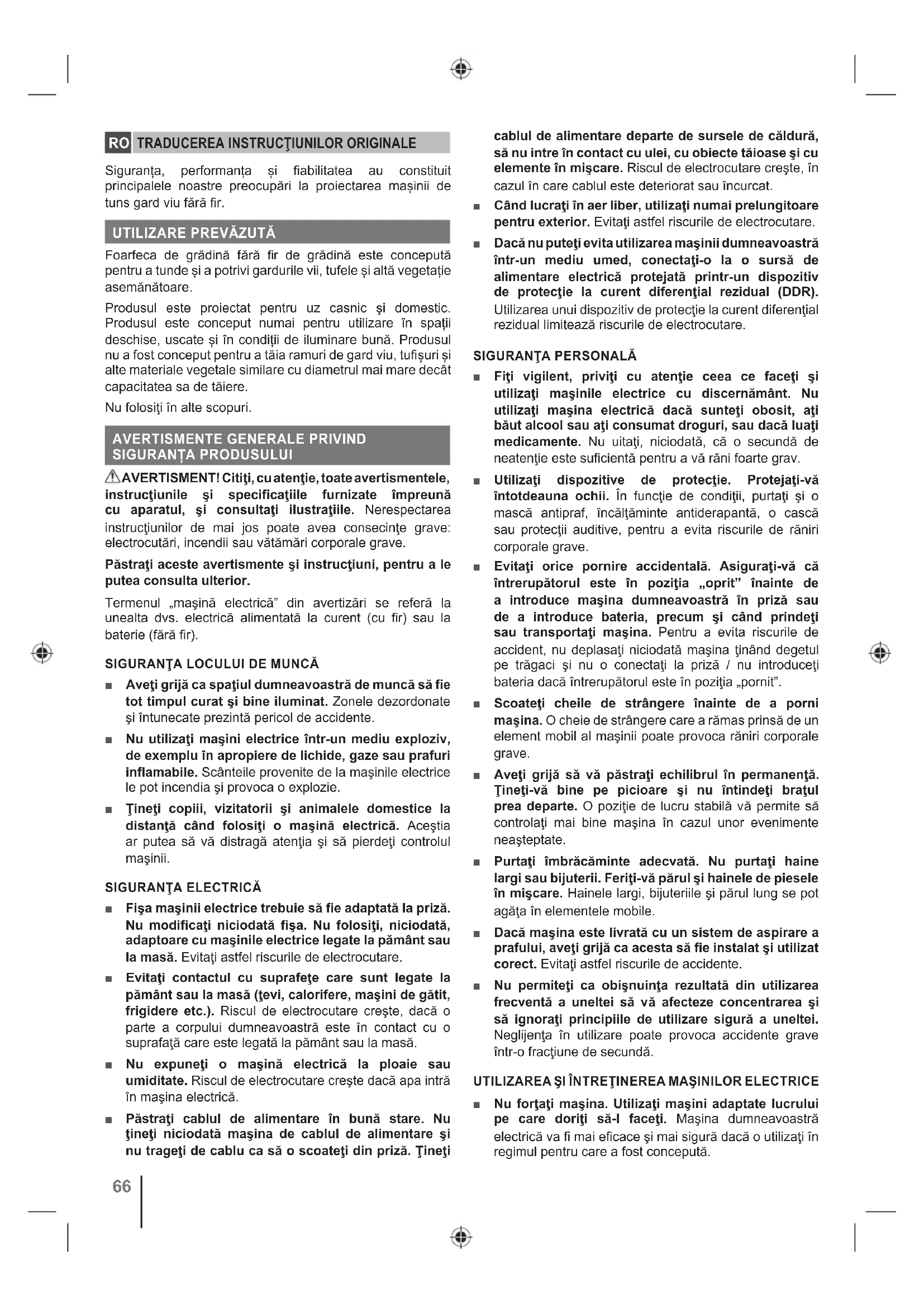 SIMBOLURI Avertizare de siguranţă Citiți și înțelegeți toate instrucțiunile înainte de a utiliza produsul. Respectați toate avertismentele și instrucțiunile de siguranță. Purtați echipament de protecție pentru ochi, urechi și cap. Purtaţi mănuşi care nu alunecă, de protecţie la sarcinile difi cile. Purtați încălțăminte de protecție anti- alunecare în timpul utilizării produsului. Pentru prevenirea vătămării grave nu atingeţi lamele de tăiere. Atunci când operați produsul, încercați să-l țineți cu ambele mâini. Nu expuneți produsul la ploaie sau umezeală. Feriţi-vă de obiecte proiectate sau în zbor. Mențineți o distanță de cel puțin 15 m între zona de lucru și persoanele prezente, mai ales copii și animale. Decuplaţi acumulatorul înainte de a realiza orice fel de operaţie de întreţinere sau reparaţie asupra produsului. Nivel garantat al puterii acustice A nu se arunca deșeurile de echipamente electronice și electrice și bateriile epuizate la gunoiul menajer. Deșeurile formate din echipamente electrice și electronice și bateriile epuizate trebuie colectate separat. Sursele de iluminare, bateriile și acumulatorii epuizați trebuie scoase din aceste echipamente. Solicitați consiliere de la autoritatea dvs. locală sau de la comerciantul de unde ați achiziționat aspiratorul, în privința punctului de colectare. Conform reglementărilor naționale, vânzătorii cu amănuntul au obligația de a colecta bateriile epuizate, deșeurile de echipament electric și electronic, gratuit. Contribuția dvs. la reciclarea și reutilizarea bateriilor, a echipamentelor electrice și electronice ajută la reducerea cererii de materii prime. Bateriile epuizate, în special cele cu litiu, deșeurile formate din echipamente electrice și electronice conțin materiale reciclabile valoroase, care pot avea o infl uență negativă asupra mediului înconjurător și asupra sănătății umane, dacă nu sunt eliminate într-o manieră ecologică. Ștergeți datele personale din echipamentul deșeu, dacă este cazul.70