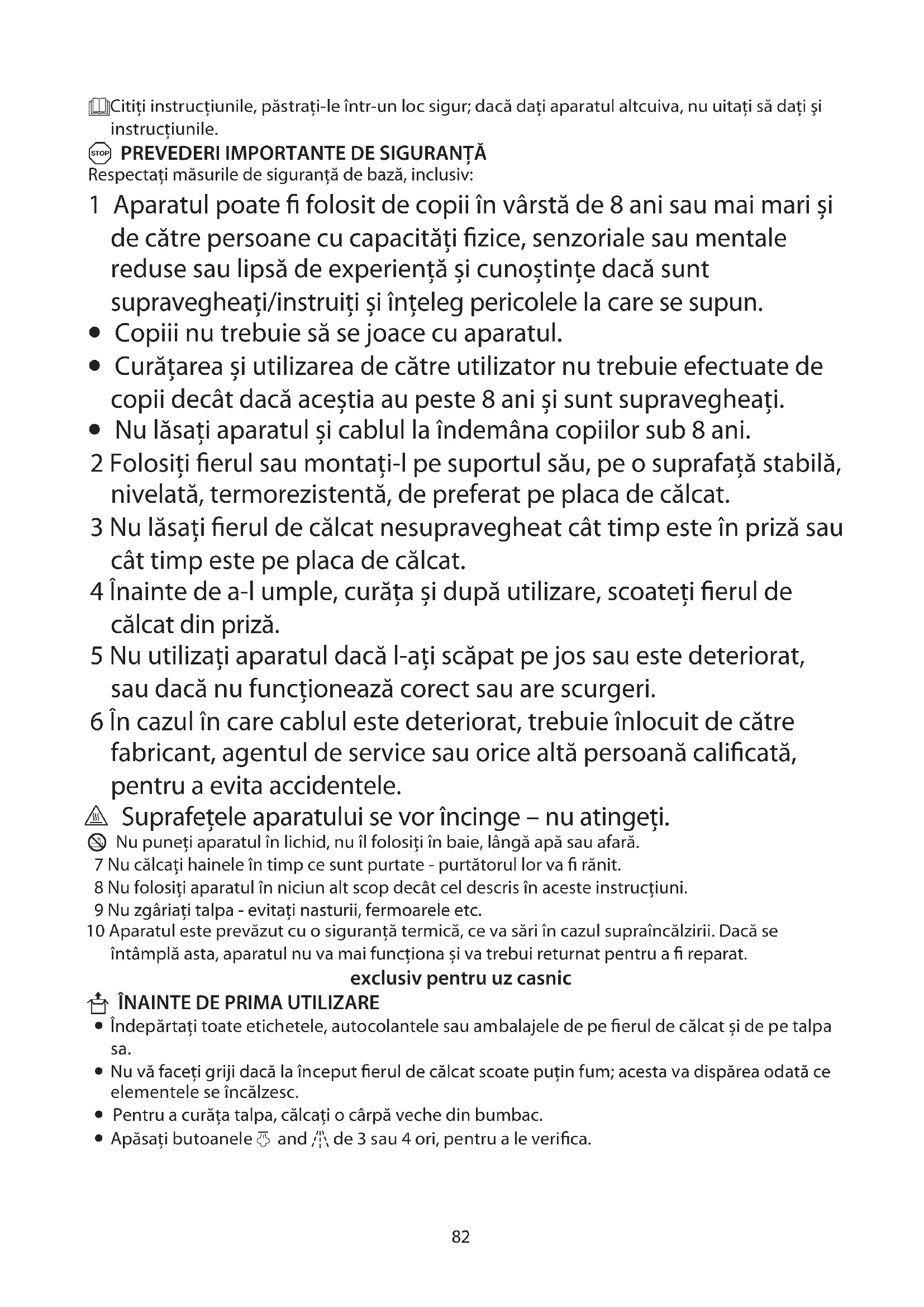 - Nu lăsaţi aparatul și cablul la îndemâna copiilor sub 8 ani. 2 Folosiţi fierul sau montaţi-l pe suportul său, pe o suprafaţă stabilă, nivelată, termorezistentă, de preferat pe placa de călcat. 3 Nu lăsaţi fierul de călcat nesupravegheat cât timp este în priză sau cât timp este pe placa de călcat. 4 Înainte de a-l umple, curăţa și după utilizare, scoateţi fierul de călcat din priză. 5 Nu utilizaţi aparatul dacă l-aţi scăpat pe jos sau este deteriorat, sau dacă nu funcţionează corect sau are scurgeri. 6 În cazul în care cablul este deteriorat, trebuie înlocuit de către fabricant, agentul de service sau orice altă persoană calificată, pentru a evita accidentele. h Suprafeţele aparatului se vor încinge – nu atingeţi. L Nu puneţi aparatul în lichid, nu îl folosiţi în baie, lângă apă sau afară. 7 Nu călcaţi hainele în timp ce sunt purtate - purtătorul lor va fi rănit. 8 Nu folosiţi aparatul în niciun alt scop decât cel descris în aceste instrucţiuni. 9 Nu zgâriaţi talpa - evitaţi nasturii, fermoarele etc. 10 Aparatul este prevăzut cu o siguranţă termică, ce va sări în cazul supraîncălzirii. Dacă se întâmplă asta, aparatul nu va mai funcţiona și va trebui returnat pentru a fi reparat. exclusiv pentru uz casnic