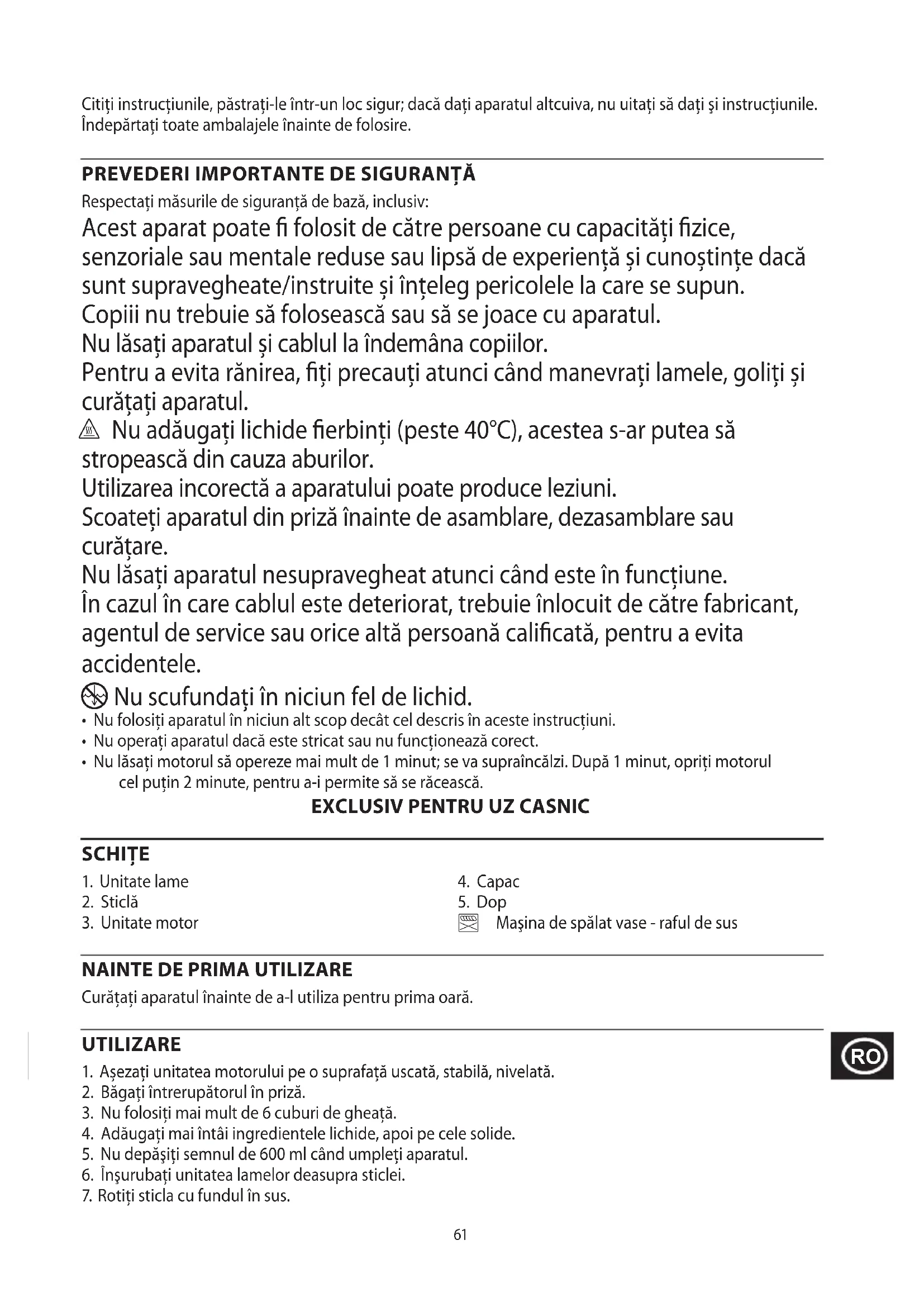 Respectați măsurile de siguranță de bază, inclusiv: Acest aparat poate fi folosit de către persoane cu capacități fizice, senzoriale sau mentale reduse sau lipsă de experiență și cunoștințe dacă sunt supravegheate/instruite și înțeleg pericolele la care se supun. Copiii nu trebuie să folosească sau să se joace cu aparatul. Nu lăsați aparatul și cablul la îndemâna copiilor. Pentru a evita rănirea, fiți precauți atunci când manevrați lamele, goliți și curățați aparatul. h Nu adăugați lichide fierbinți (peste 40°C), acestea s-ar putea să stropească din cauza aburilor. Utilizarea incorectă a aparatului poate produce leziuni. Scoateți aparatul din priză înainte de asamblare, dezasamblare sau curățare. Nu lăsați aparatul nesupravegheat atunci când este în funcțiune. În cazul în care cablul este deteriorat, trebuie înlocuit de către fabricant, agentul de service sau orice altă persoană calificată, pentru a evita accidentele.