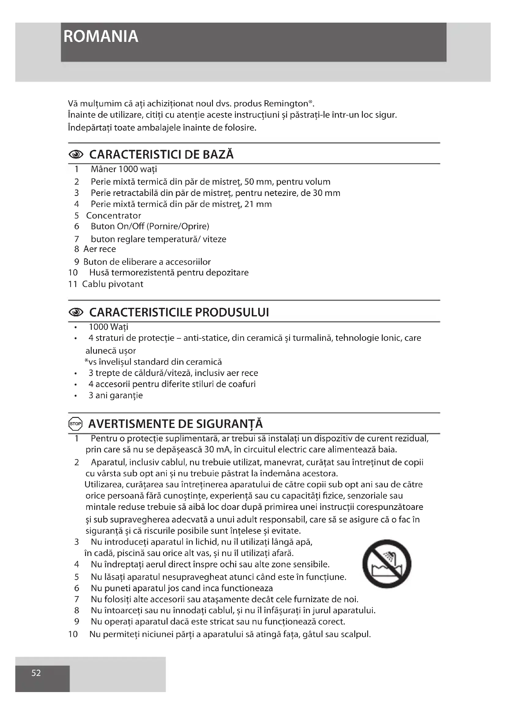 Vămulțumimcăațiachiziționatnouldvs.produsRemington®. Înaintedeutilizare,citițicuatențieacesteinstrucțiunișipăstrați-leîntr-unlocsigur. Îndepărtațitoateambalajeleînaintedefolosire.