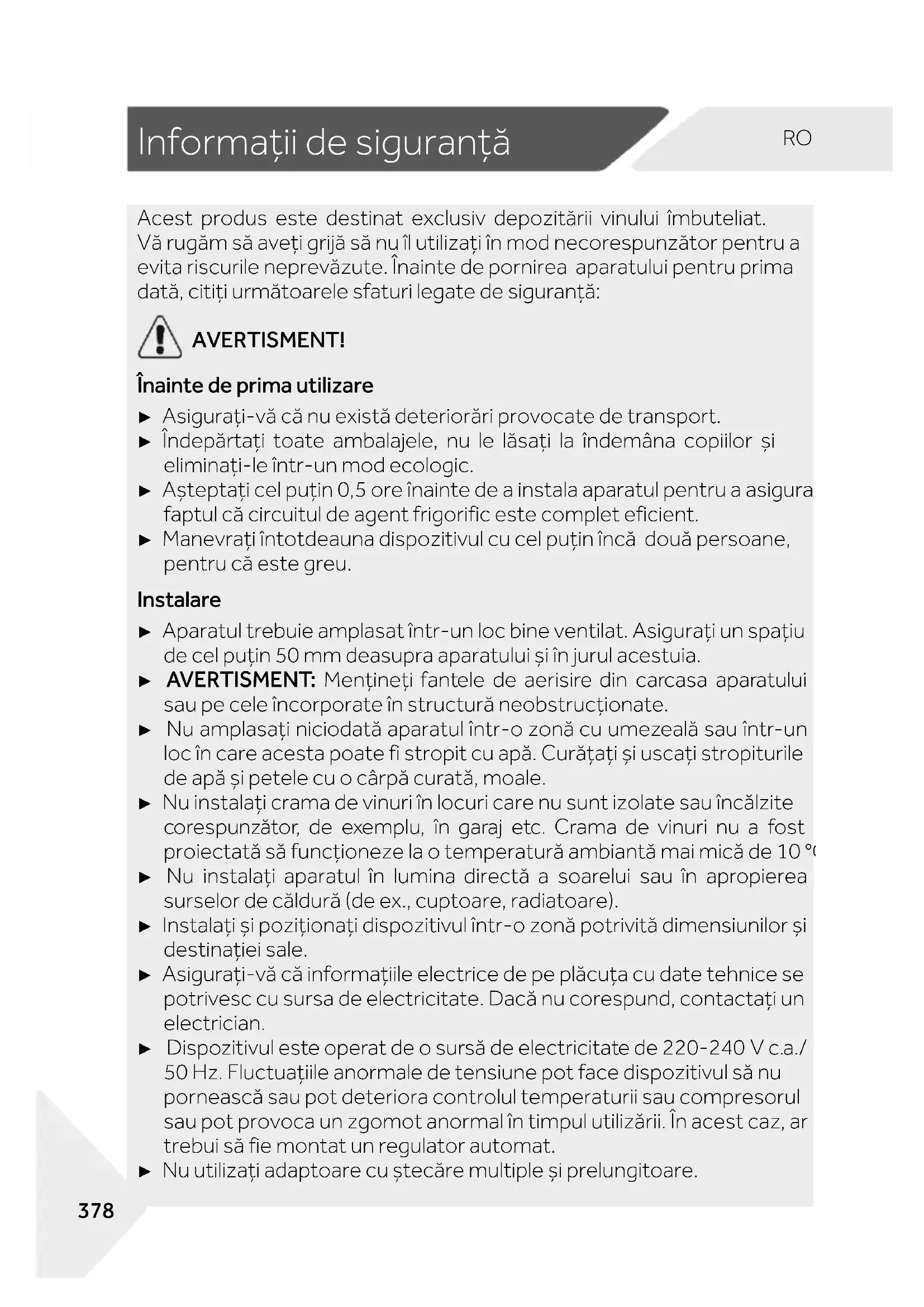 Acest produs este destinat exclusiv depozitării vinului îmbuteliat. Vă rugăm să aveți grijă să nu îl utilizați în mod necorespunzător pentru a evita riscurile neprevăzute. Înainte de pornirea aparatului pentru prima dată, citiți următoarele sfaturi legate de siguranță: AVERTISMENT! Înainte de prima utilizare ► Asigurați-vă că nu există deteriorări provocate de transport. ► Îndepărtați toate ambalajele, nu le lăsați la îndemâna copiilor și eliminați-le într-un mod ecologic. ► Așteptați cel puțin 0,5 ore înainte de a instala aparatul pentru a asigura faptul că circuitul de agent frigorific este complet eficient. ► Manevrați întotdeauna dispozitivul cu cel puțin încă două persoane, pentru că este greu. Instalare ► Aparatul trebuie amplasat într-un loc bine ventilat. Asigurați un spațiu de cel puțin 50 mm deasupra aparatului și în jurul acestuia. ► AVERTISMENT: Mențineți fantele de aerisire din carcasa aparatului sau pe cele încorporate în structură neobstrucționate. ► Nu amplasați niciodată aparatul într-o zonă cu umezeală sau într-un loc în care acesta poate fi stropit cu apă. Curățați și uscați stropiturile de apă și petele cu o cârpă curată, moale. ► Nu instalați crama de vinuri în locuri care nu sunt izolate sau încălzite corespunzător, de exemplu, în garaj etc. Crama de vinuri nu a fost proiectată să funcționeze la o temperatură ambiantă mai mică de 10 °C. ► Nu instalați aparatul în lumina directă a soarelui sau în apropierea surselor de căldură (de ex., cuptoare, radiatoare). ► Instalați și poziționați dispozitivul într-o zonă potrivită dimensiunilor și destinației sale. ► Asigurați-vă că informațiile electrice de pe plăcuța cu date tehnice se potrivesc cu sursa de electricitate. Dacă nu corespund, contactați un electrician. ► Dispozitivul este operat de o sursă de electricitate de 220-240 V c.a./ 50 Hz. Fluctuațiile anormale de tensiune pot face dispozitivul să nu pornească sau pot deteriora controlul temperaturii sau compresorul sau pot provoca un zgomot anormal în timpul utilizării. În acest caz, ar trebui să fie montat un regulator automat. ► Nu utilizați adaptoare cu ștecăre multiple și prelungitoare.Informații de siguranță