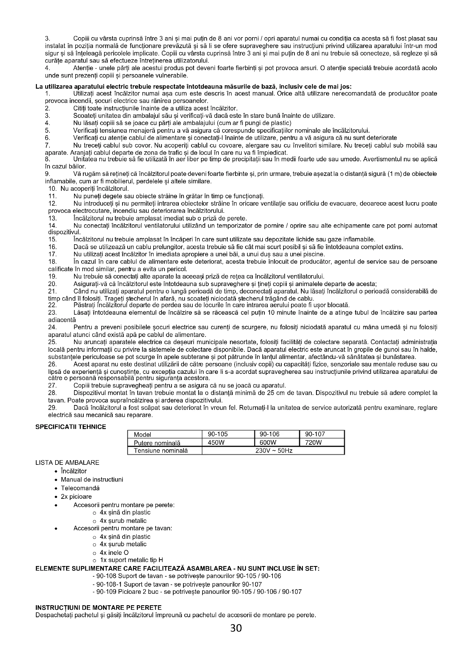 28. Dispozitivul montat în tavan trebuie montat la o distanță minimă de 25 cm de tavan. Dispozitivul nu trebuie să adere complet la tavan. Poate provoca supraîncălzirea și arderea dispozitivului. 29. Dacă încălzitorul a fost scăpat sau deteriorat în vreun fel. Returnați-l la unitatea de service autorizată pentru examinare, reglare electrică sau mecanică sau reparare. SPECIFICATII TEHNICE Model 90-105 90-106 90-107 Putere nominală 450W 600W 720W Tensiune nominală 230V ~ 50Hz