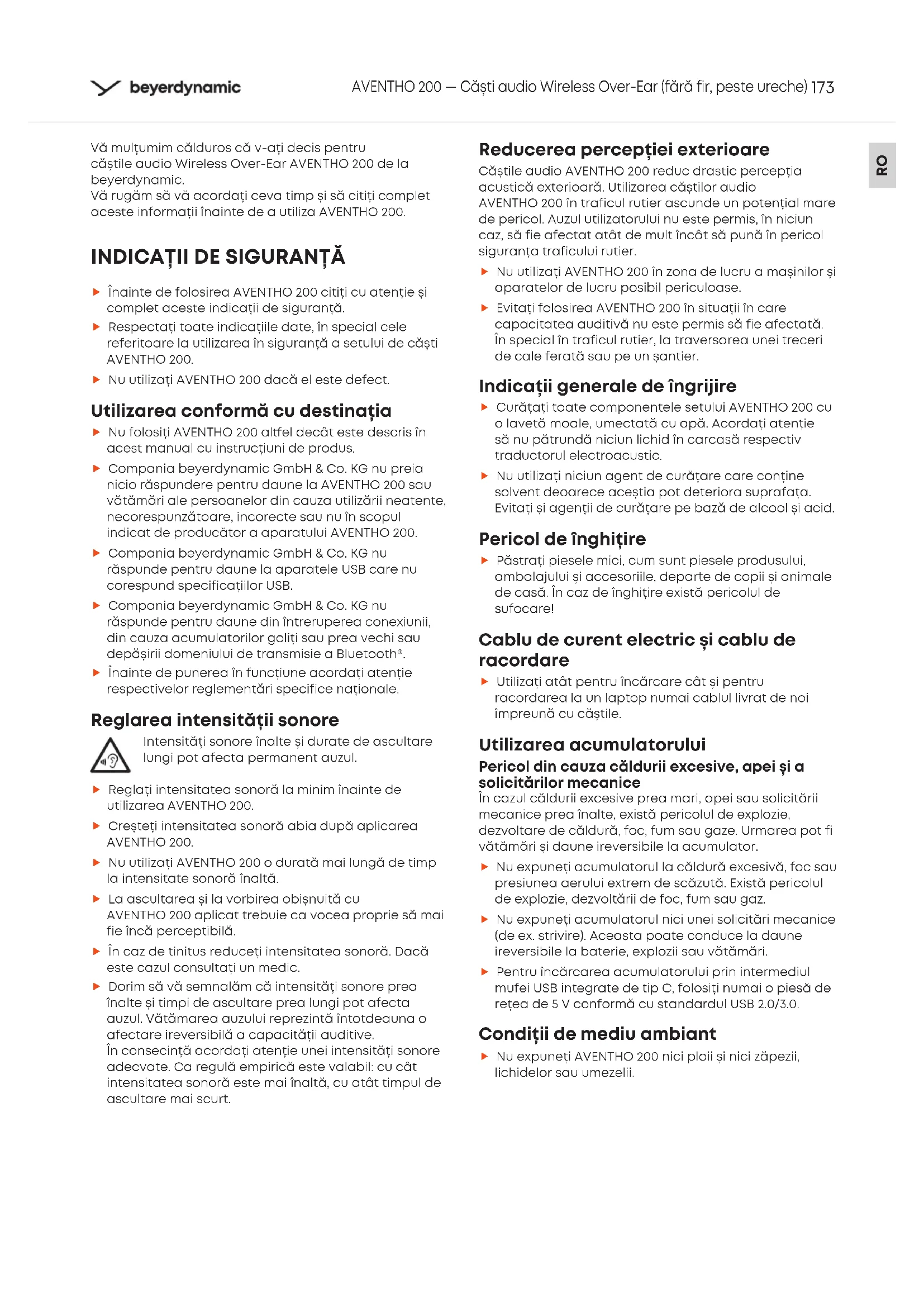 Înainte de folosirea AVENTHO 200 citiți cu atenție și complet acee indicații de siguranță. Respectați toate indicațiile date, în special cele referitoare la utilizarea în siguranță a setului de căști AVENTHO 200. Nu utilizați AVENTHO 200 dacă el ee defect. Utilizarea conformă cu deinația Nu folosiți AVENTHO 200 alel decât ee descris în ace manual cu inrucțiuni de produs. Compania beyerdynamic GmbH & Co. KG nu preia nicio răspundere pentru daune la AVENTHO 200 sau vătămări ale persoanelor din cauza utilizării neatente, necorespunzătoare, incorecte sau nu în scopul indicat de producător a aparatului AVENTHO 200. Compania beyerdynamic GmbH & Co. KG nu răspunde pentru daune la aparatele USB care nu corespund specificațiilor USB. Compania beyerdynamic GmbH & Co. KG nu răspunde pentru daune din întreruperea conexiunii, din cauza acumulatorilor goliți sau prea vechi sau depășirii domeniului de transmisie a Bluetooth®. Înainte de punerea în funcțiune acordați atenție respectivelor reglementări specifice naționale. Reglarea intensității sonore Intensități sonore înalte și durate de ascultare lungi pot afecta permanent auzul. Reglați intensitatea sonoră la minim înainte de utilizarea AVENTHO 200. Creșteți intensitatea sonoră abia după aplicarea AVENTHO 200. Nu utilizați AVENTHO 200 o durată mai lungă de timp la intensitate sonoră înaltă. La ascultarea și la vorbirea obișnuită cu AVENTHO 200 aplicat trebuie ca vocea proprie să mai fie încă perceptibilă. În caz de tinitus reduceți intensitatea sonoră. Dacă ee cazul consultați un medic. Dorim să vă semnalăm că intensități sonore prea înalte și timpi de ascultare prea lungi pot afecta auzul. Vătămarea auzului reprezintă întotdeauna o afectare ireversibilă a capacității auditive. În consecință acordați atenție unei intensități sonore adecvate. Ca regulă empirică ee valabil: cu cât intensitatea sonoră ee mai înaltă, cu atât timpul de ascultare mai scu. Reducerea percepției exterioare Căștile audio AVENTHO 200 reduc draic percepția acuică exterioară. Utilizarea căștilor audio AVENTHO 200 în traficul rutier ascunde un potențial mare de pericol. Auzul utilizatorului nu ee permis, în niciun caz, să fie afectat atât de mult încât să pună în pericol siguranța traficului rutier. Nu utilizați AVENTHO 200 în zona de lucru a mașinilor și aparatelor de lucru posibil periculoase. Evitați folosirea AVENTHO 200 în situații în care capacitatea auditivă nu ee permis să fie afectată. În special în traficul rutier, la traversarea unei treceri de cale ferată sau pe un șantier. Indicații generale de îngrijire Curățați toate componentele setului AVENTHO 200 cu o lavetă moale, umectată cu apă. Acordați atenție să nu pătrundă niciun lichid în carcasă respectiv traductorul electroacuic. Nu utilizați niciun agent de curățare care conține solvent deoarece aceștia pot deteriora suprafața. Evitați și agenții de curățare pe bază de alcool și acid. Pericol de înghițire Părați piesele mici, cum sunt piesele produsului, ambalajului și accesoriile, depae de copii și animale de casă. În caz de înghițire exiă pericolul de sufocare! Cablu de curent electric și cablu de racordare Utilizați atât pentru încărcare cât și pentru racordarea la un laptop numai cablul livrat de noi împreună cu căștile. Utilizarea acumulatorului Pericol din cauza căldurii excesive, apei și a solicitărilor mecanice În cazul căldurii excesive prea mari, apei sau solicitării mecanice prea înalte, exiă pericolul de explozie, dezvoltare de căldură, foc, fum sau gaze. Urmarea pot fi vătămări și daune ireversibile la acumulator. Nu expuneți acumulatorul la căldură excesivă, foc sau presiunea aerului extrem de scăzută. Exiă pericolul de explozie, dezvoltării de foc, fum sau gaz. Nu expuneți acumulatorul nici unei solicitări mecanice (de ex. rivire). Aceaa poate conduce la daune ireversibile la baterie, explozii sau vătămări. Pentru încărcarea acumulatorului prin intermediul mufei USB integrate de tipC, folosiți numai o piesă de rețea de 5V conformă cu andardul USB2.0/3.0. Condiții de mediu ambiant Nu expuneți AVENTHO 200 nici ploii și nici zăpezii, lichidelor sau umezelii.174