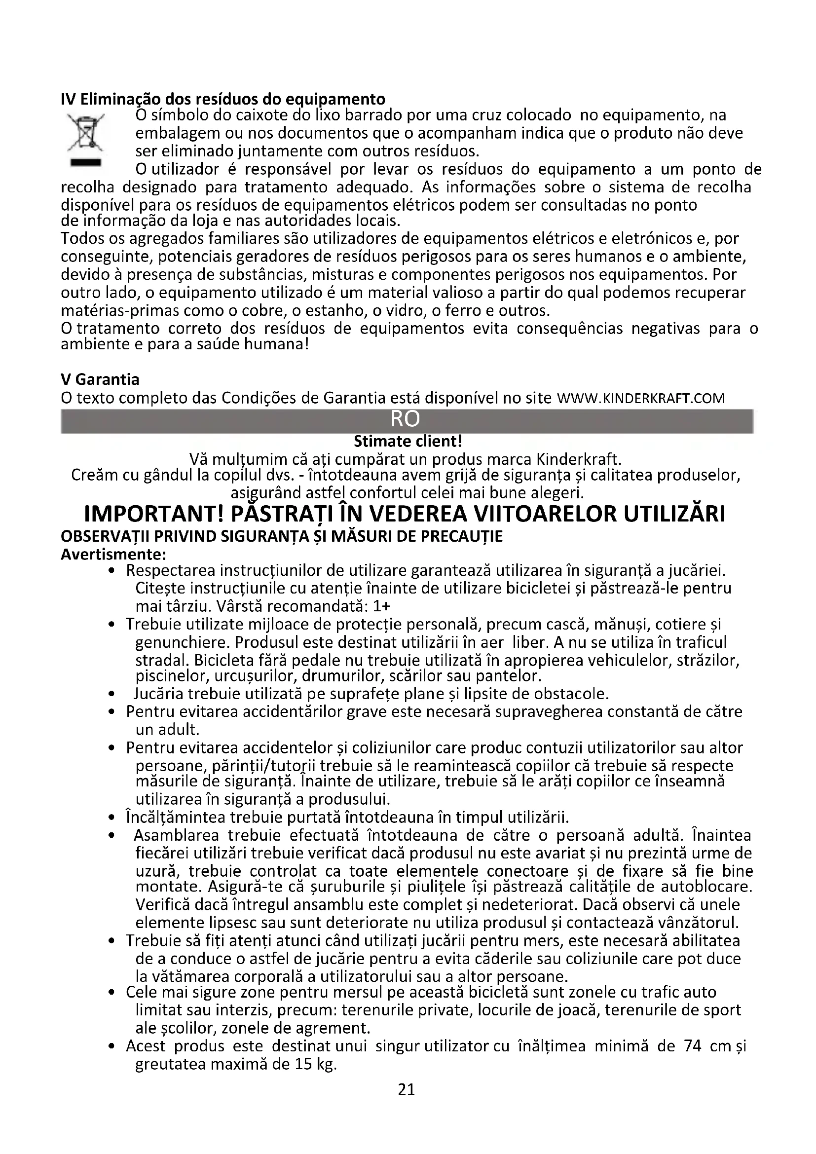 - Acest produs este destinat unui singur utilizator cu înălțimea minimă de 74 cm și greutatea maximă de 15 kg. RO22