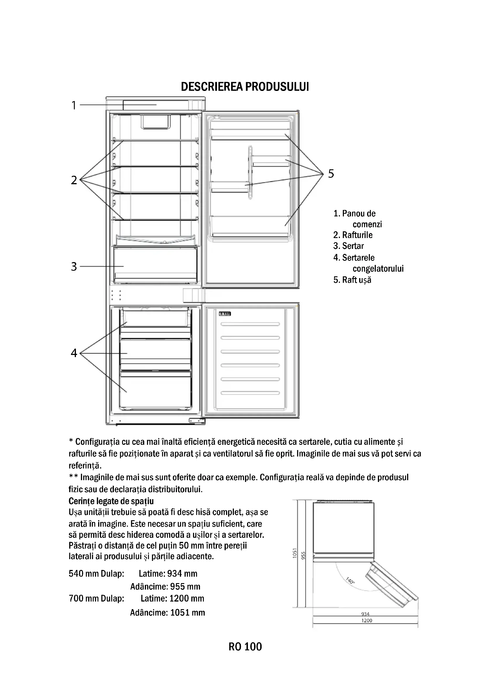 - Configurația cu cea mai înaltă eficiență energetică necesită ca sertarele, cutia cu alimente și rafturile să fie poziționate în aparat și ca ventilatorul să fie oprit. Imaginile de mai sus vă pot servi ca referință. ** Imaginile de mai sus sunt oferite doar ca exemple. Configurația reală va depinde de produsul fizic sau de declarația distribuitorului. Cerin țe legate de spațiu Ușa unității trebuie să poată fi desc hisă complet, așa se arată în imagine. Este necesar un spațiu suficient, care să permită desc hiderea comodă a ușilor și a sertarelor. Păstrați o distanță de cel puțin 50 mm între pereții laterali ai produsului și părțile adiacente. 540 mm Dulap: Latime: 934 mm Adâncime: 955 mm 700 mm Dulap: Latime: 1200 mm Adâncime: 1051 mm