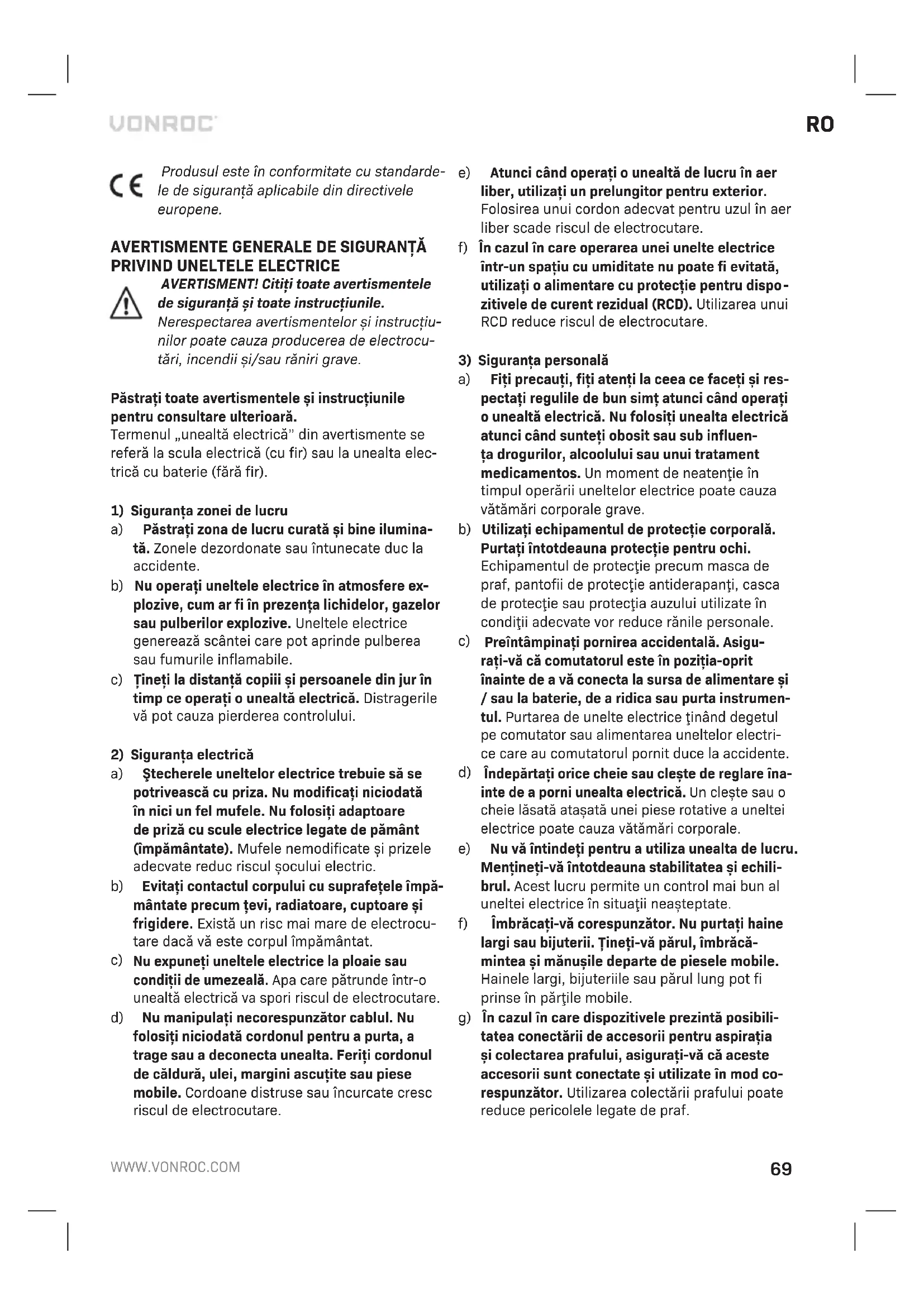 Înainte de curăţare şi întreţinere, opriţi alimentarea electrică a maşinii şi scoateţi acumulatorul din maşină. Curăţaţi regulat carcasa cu o cârpă moale, de preferat după fiecare utilizare. Curăţaţi fantele de aerisire de praf şi murdărie. Îndepărtaţi murdăria persistentă cu o cârpă moale înmuiată în clăbuci de săpun. Nu folosiţi solvenţi precum benzină, alcool, amoniac etc. Astfel de substanţe chimice vor dete- riora componentele sintetice. GARANŢIE Produsele VONROC sunt realizate la cele mai înalte standarde de calitate şi sunt garantate în privinţa materialelor şi a manoperei pentru întreaga perioa- dă de utilizare în garanţie, începând cu data achizi- ţiei. În cazul în care produsul prezintă defecţiuni în perioada de garanţie din cauza materialului defect şi/sau a manoperei, contactaţi direct VONROC. Următoarele circumstanţe sunt excluse de la această garanţie: