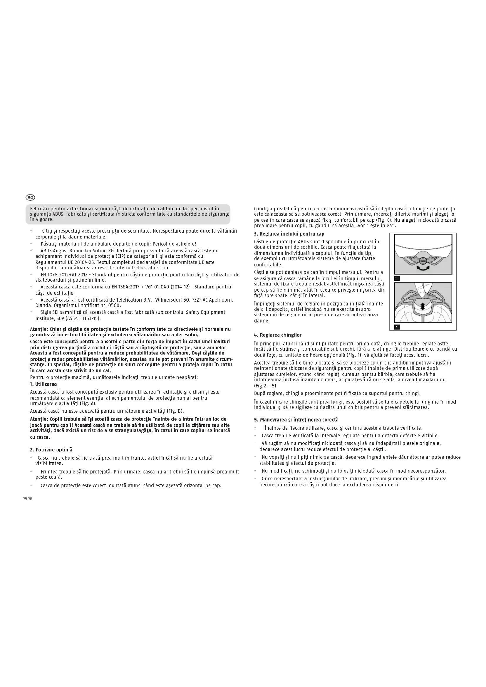 - ABUS August Bremicker Söhne KG declară prin prezenta că această cască este un echipament individual de protecţie (EIP) de categoria II şi este conformă cu Regulamentul UE 2016/425. Textul complet al declaraţiei de conformitate UE este disponibil la următoarea adresă de internet: docs.abus.com