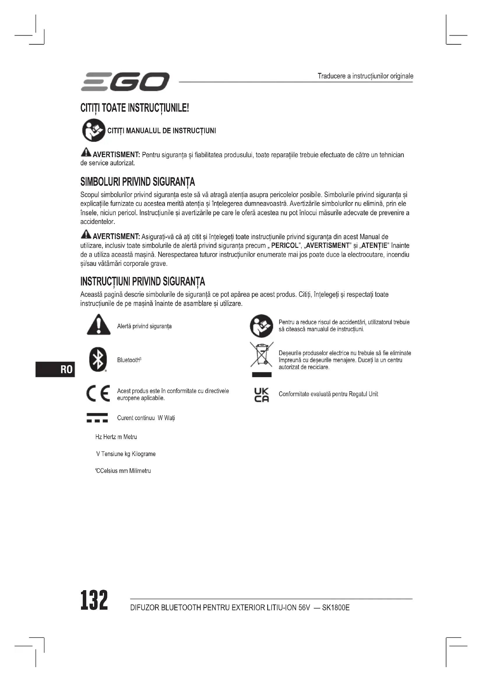 Această pagină descrie simbolurile de siguranță ce pot apărea pe acest produs. Citiți, înțelegeți și respectați toate instrucțiunile de pe mașină înainte de asamblare și utilizare. Alertă privind siguranțaPentru a reduce riscul de accidentări, utilizatorul trebuie să citească manualul de instrucțiuni.Bluetooth Deșeurile produselor electrice nu trebuie să e eliminate împreună cu deșeurile menajere. Duceți la un centru autorizat de reciclare.Acest produs este în conformitate cu directivele europene aplicabile.Conformitate evaluată pentru Regatul UnitCurent continuu W Wați Hz Hertz m MetruV Tensiune kg Kilograme C Celsius mm Milimetru Traducere a instrucțiunilor originale133
