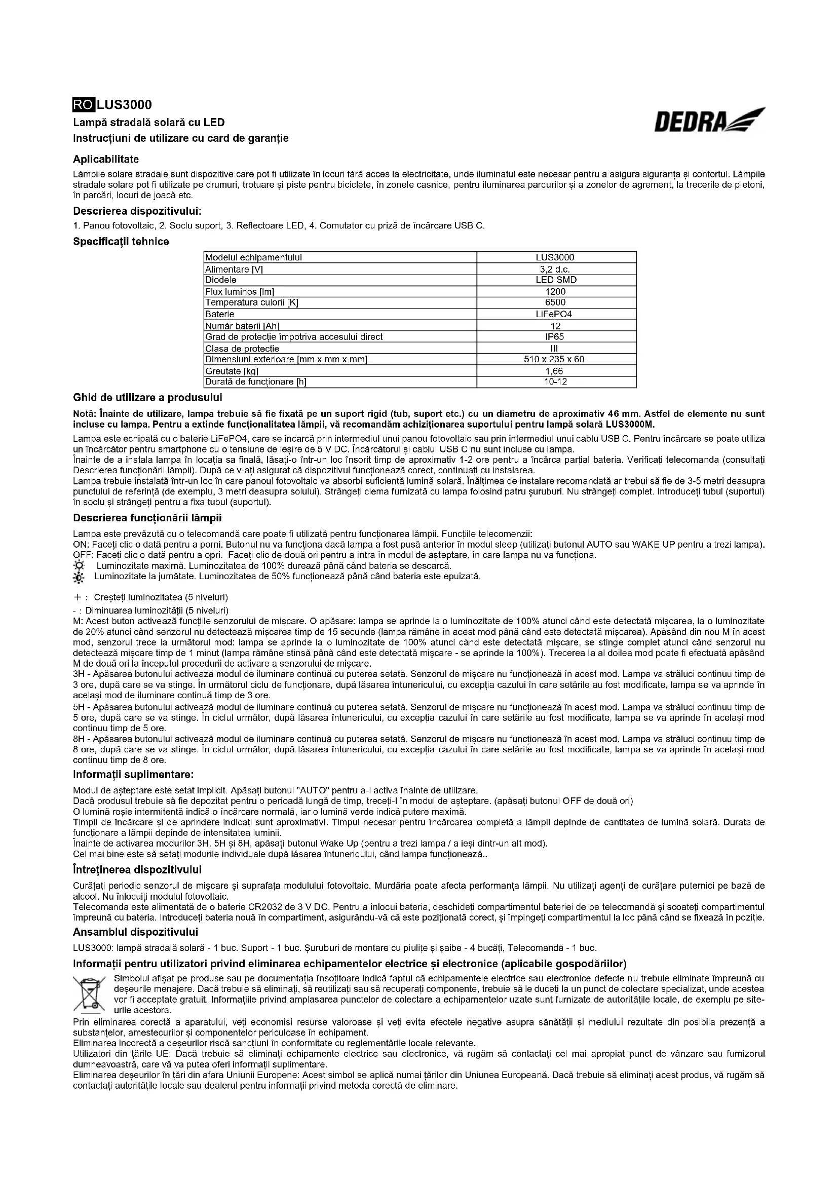 Grad de protecție împotriva accesului direct IP65 Clasa de protecție III Dimensiuni exterioare [mm x mm x mm] 510 x 235 x 60 Greutate [kg] 1,66 Durată de funcționare [h] 10-12 Ghid de utilizare a produsului Notă: Înainte de utilizare, lampa trebuie să fie fixată pe un suport rigid (tub, suport etc.) cu un diametru de aproximativ 46 mm. Astfel de elemente nu sunt incluse cu lampa. Pentru a extinde funcționalitatea lămpii, vă recomandăm achiziționarea suportului pentru lampă solară LUS3000M. Lampa este echipată cu o baterie LiFePO4, care se încarcă prin intermediul unui panou fotovoltaic sau prin intermediul unui cablu USB C. Pentru încărcare se poate utiliza un încărcător pentru smartphone cu o tensiune de ieșire de 5 V DC. Încărcătorul și cablul USB C nu sunt incluse cu lampa. Înainte de a instala lampa în locația sa finală, lăsați-o într-un loc însorit timp de aproximativ 1-2 ore pentru a încărca parțial bateria. Verificați telecomanda (consultați Descrierea funcționării lămpii). După ce v-ați asigurat că dispozitivul funcționează corect, continuați cu instalarea. Lampa trebuie instalată într-un loc în care panoul fotovoltaic va absorbi suficientă lumină solară. Înălțimea de instalare recomandată ar trebui să fie de 3-5 metri deasupra punctului de referință (de exemplu, 3 metri deasupra solului). Strângeți clema furnizată cu lampa folosind patru șuruburi. Nu strângeți complet. Introduceți tubul (suportul) în soclu și strângeți pentru a fixa tubul (suportul). Descrierea funcționării lămpii Lampa este prevăzută cu o telecomandă care poate fi utilizată pentru funcționarea lămpii. Funcțiile telecomenzii: ON: Faceți clic o dată pentru a porni. Butonul nu va funcționa dacă lampa a fost pusă anterior în modul sleep (utilizați butonul AUTO sau WAKE UP pentru a trezi lampa). OFF: Faceți clic o dată pentru a opri. Faceți clic de două ori pentru a intra în modul de așteptare, în care lampa nu va funcționa. Luminozitate maximă. Luminozitatea de 100% durează până când bateria se descarcă. Luminozitate la jumătate. Luminozitatea de 50% funcționează până când bateria este epuizată. +: Creșteți luminozitatea (5 niveluri) -:Diminuarea luminozității (5 niveluri) M: Acest buton activează funcțiile senzorului de mișcare. O apăsare: lampa se aprinde la o luminozitate de 100% atunci când este detectată mișcarea, la o luminozitate de 20% atunci când senzorul nu detectează mișcarea timp de 15 secunde (lampa rămâne în acest mod până când este detectată mișcarea). Apăsând din nou M în acest mod, senzorul trece la următorul mod: lampa se aprinde la o luminozitate de 100% atunci când este detectată mișcare, se stinge complet atunci când senzorul nu detectează mișcare timp de 1 minut (lampa rămâne stinsă până când este detectată mișcare - se aprinde la 100%). Trecerea la al doilea mod poate fi efectuată apăsând M de două ori la începutul procedurii de activare a senzorului de mișcare. 3H - Apăsarea butonului activează modul de iluminare continuă cu puterea setată. Senzorul de mișcare nu funcționează în acest mod. Lampa va străluci continuu timp de 3 ore, după care se va stinge. În următorul ciclu de funcționare, după lăsarea întunericului, cu excepția cazului în care setările au fost modificate, lampa se va aprinde în același mod de iluminare continuă timp de 3 ore. 5H - Apăsarea butonului activează modul de iluminare continuă cu puterea setată. Senzorul de mișcare nu funcționează în acest mod. Lampa va străluci continuu timp de 5 ore, după care se va stinge. În ciclul următor, după lăsarea întunericului, cu excepția cazului în care setările au fost modificate, lampa se va aprinde în același mod continuu timp de 5 ore. 8H - Apăsarea butonului activează modul de iluminare continuă cu puterea setată. Senzorul de mișcare nu funcționează în acest mod. Lampa va străluci continuu timp de 8 ore, după care se va stinge. În ciclul următor, după lăsarea întunericului, cu excepția cazului în care setările au fost modificate, lampa se va aprinde în același mod continuu timp de 8 ore. Informații suplimentare: Modul de așteptare este setat implicit. Apăsați butonul "AUTO" pentru a-l activa înainte de utilizare. Dacă produsul trebuie să fie depozitat pentru o perioadă lungă de timp, treceți-l în modul de așteptare. (apăsați butonul OFF de două ori) O lumină roșie intermitentă indică o încărcare normală, iar o lumină verde indică putere maximă. Timpii de încărcare și de aprindere indicați sunt aproximativi. Timpul necesar pentru încărcarea completă a lămpii depinde de cantitatea de lumină solară. Durata de funcționare a lămpii depinde de intensitatea luminii. Înainte de activarea modurilor 3H, 5H și 8H, apăsați butonul Wake Up (pentru a trezi lampa / a ieși dintr-un alt mod). Cel mai bine este să setați modurile individuale după lăsarea întunericului, când lampa funcționează.. Întreținerea dispozitivului Curățați periodic senzorul de mișcare și suprafața modulului fotovoltaic. Murdăria poate afecta performanța lămpii. Nu utilizați agenți de curățare puternici pe bază de alcool. Nu înlocuiți modulul fotovoltaic. Telecomanda este alimentată de o baterie CR2032 de 3 V DC. Pentru a înlocui bateria, deschideți compartimentul bateriei de pe telecomandă și scoateți compartimentul împreună cu bateria. Introduceți bateria nouă în compartiment, asigurându-vă că este poziționată corect, și împingeți compartimentul la loc până când se fixează în poziție. Ansamblul dispozitivului LUS3000: lampă stradală solară - 1 buc. Suport - 1 buc. Șuruburi de montare cu piulițe și șaibe - 4 bucăți, Telecomandă - 1 buc. Informații pentru utilizatori privind eliminarea echipamentelor electrice și electronice (aplicabile gospodăriilor) Si