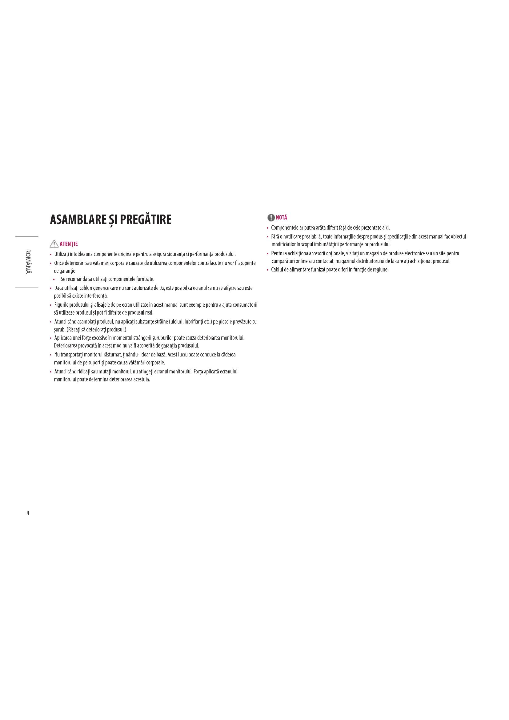 Dacă au loc tunete şi descărcări electrice, nu atingeţi niciodată cablul de alimentare şi cablul de semnal, acest lucru fiind deosebit de periculos. Acest lucru poate provoca electrocutări.2 ENG ROMANESTE Precauţii imPortante Referitor la instalare Asiguraţi-vă că nimic nu este rezemat sau trece peste cablul de alimentare şi nu aşezaţi monitorul într-un loc în care cablul de alimentare poate fi deteriorat. Nu utilizaţi monitorul lângă surse cu apă, precum căzi, lighene, chiuvete de bucătărie, căzi de spălat rufe, într-un subsol umed sau în apropierea unei piscine. Monitoarele sunt prevăzute cu orificii de ventilaţie în carcasă, pentru a elibera căldura generată în timpul funcţionării. Dacă aceste orificii sunt obturate, căldura acumulată poate provoca defecţiuni ce pot provoca un incendiu. Prin urmare, NU:
