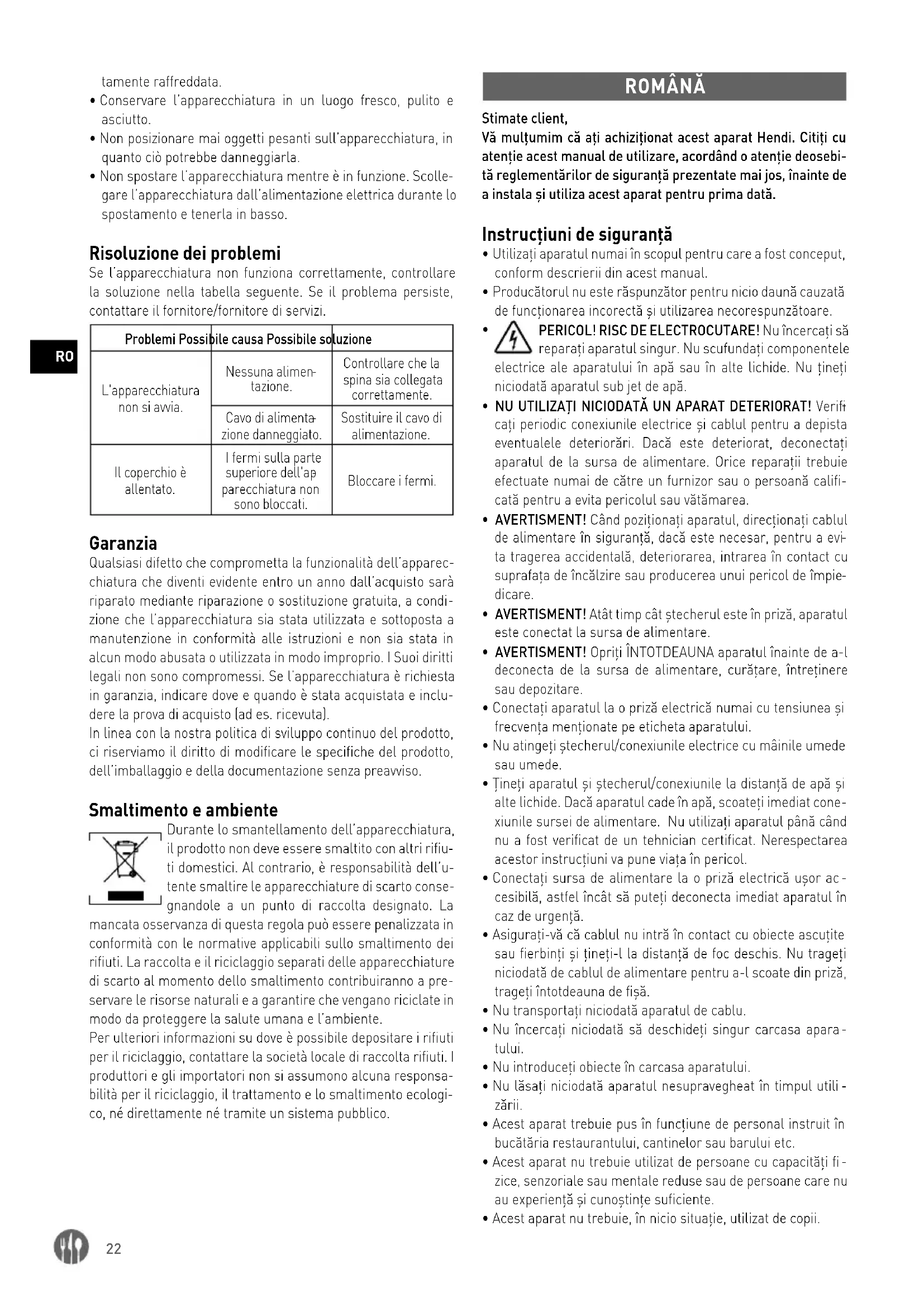 bilità per il riciclaggio, il trattamento e lo smaltimento ecologi- co, né direttamente né tramite un sistema pubblico. ROMÂNĂ Stimate client, Vă mulțumim că ați achiziționat acest aparat Hendi. Citiți cu atenție acest manual de utilizare, acordând o atenție deosebi