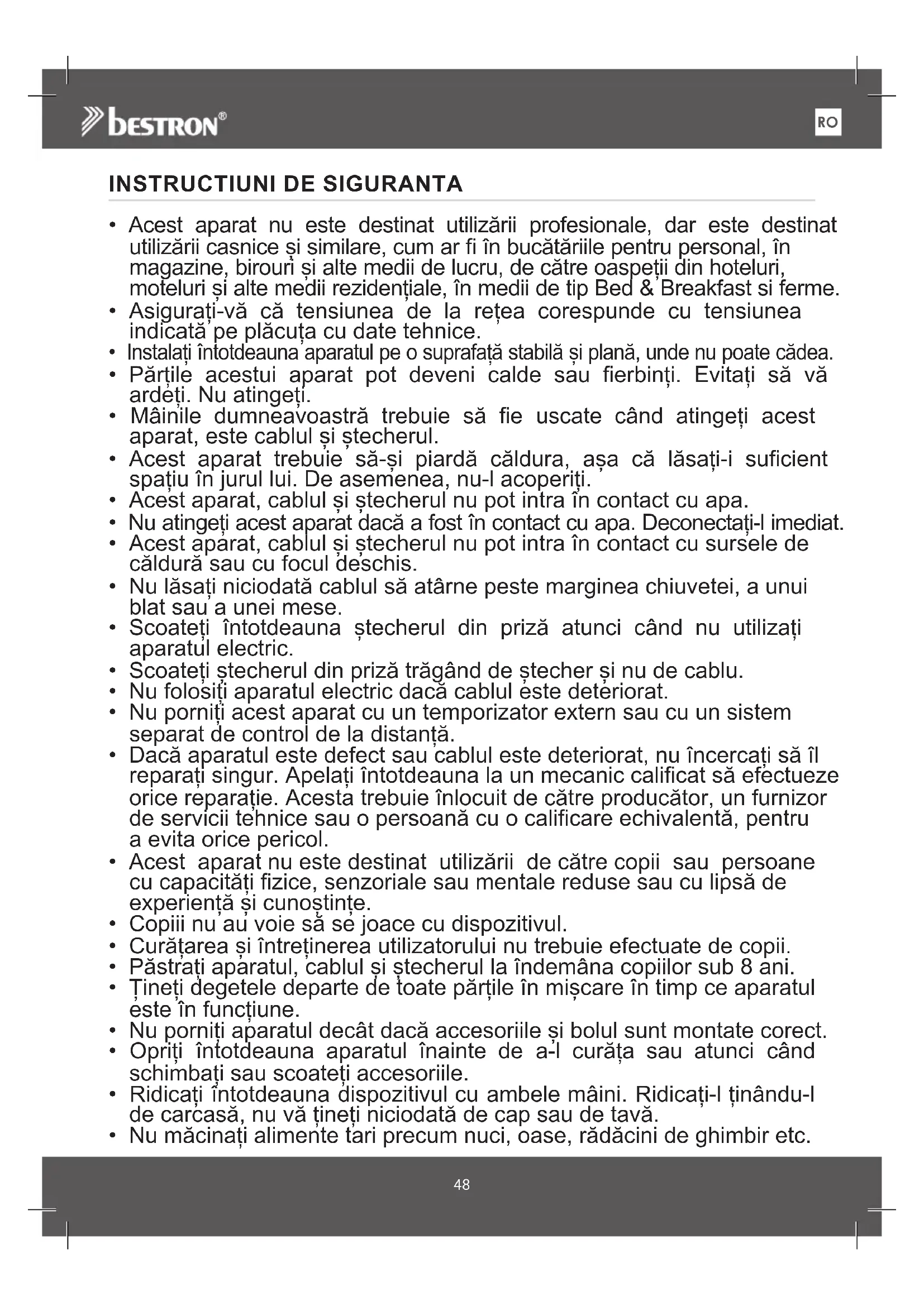 - Municipalitatea dumneavoastră vă poate spune unde puteți găsi punctul de colectare a deșeurilor desemnat în cartierul dumneavoastră. SERVICIU În cazul puțin probabil al unei defecțiuni, vă rugăm să contactați serviciul pentru clienți Bestron: www.bestron.com/service FUNCȚIONARE - Informații generale Descrierea de mai jos merge cu imaginea de la pagina 2.