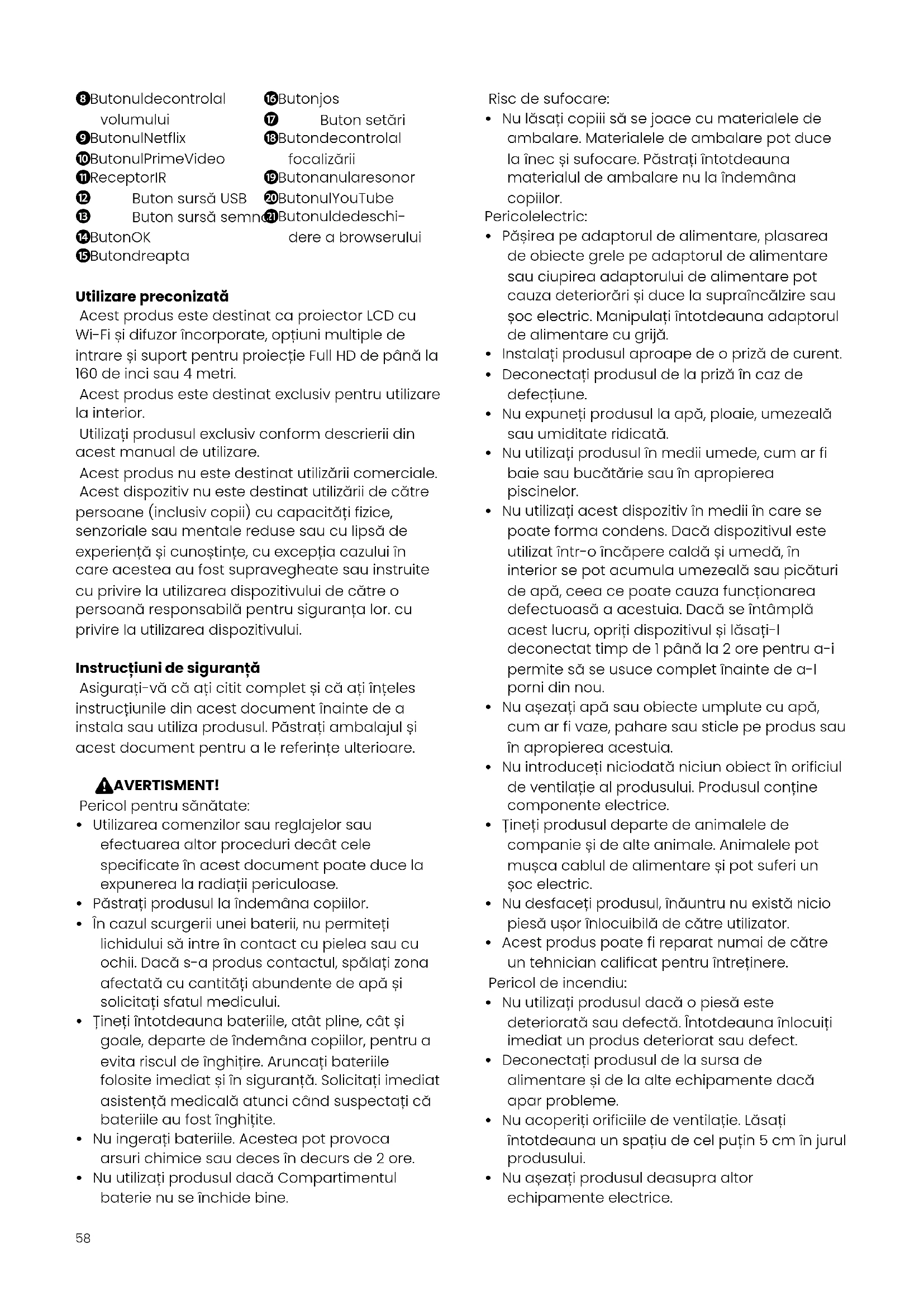 Butonul de deschi- dere a browserului Utilizare preconizată Acest produs este destinat ca proiector LCD cu Wi-Fișidifuzorîncorporate,opțiunimultiplede intrareșisuportpentruproiecțieFullHDdepânăla 160 de inci sau 4 metri. Acest produs este destinat exclusiv pentru utilizare la interior. Utilizațiprodusulexclusivconformdescrieriidin acest manual de utilizare. Acestprodusnuestedestinatutilizăriicomerciale. Acestdispozitivnuestedestinatutilizăriidecătre persoane(inclusivcopii)cucapacitățifizice, senzorialesaumentaleredusesauculipsăde experiențășicunoștințe,cuexcepțiacazuluiîn care acestea au fost supravegheate sau instruite cuprivirelautilizareadispozitivuluidecătreo persoanăresponsabilăpentrusiguranțalor.cu privire la utilizarea dispozitivului. Instrucțiuni de siguranță Asigurați-văcăațicititcompletșicăațiînțeles instrucțiuniledinacestdocumentînaintedea instalasauutilizaprodusul.Păstrațiambalajulși acestdocumentpentrualereferințeulterioare. 6 AVERTISMENT! Pericolpentrusănătate: