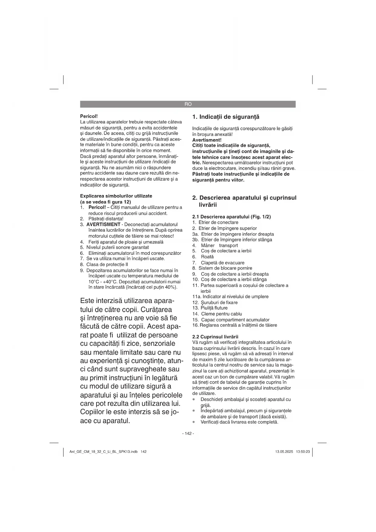 Reglarea înălţimii de tăiere: ....25-65 mm; 5 trepte Atenţie! Aparatul este livrat fără acumulatori şi aparat de încărcat, utilizarea sa este permisă numai cu acu- mulatorii Li-Ion din seria Power X-Change! Încărcarea acumulatorilor Li-Ion din seria Power X-Change este permisă numai cu încărcătorii Power X-Charger. Pericol! Zgomote şi vibraţii Valorile nivelelor de zgomot şi de vibraţie au fost calculate conform EN 62841. Purtaţi protecţie antifonică. Expunerea la zgomot poate cauza deteriorarea sau pierderea auzului. Valorile totale ale nivelului de vibraţii (suma vectorială a trei direcţii), calculate conform EN 62841. Anl_GE_CM_18_32_C_Li_BL_SPK13.indb 143Anl_GE_CM_18_32_C_Li_BL_SPK13.indb 143 13.05.2025 13:50:2313.05.2025 13:50:23RO