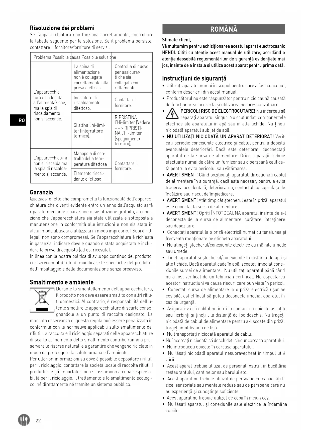 bilità per il riciclaggio, il trattamento e lo smaltimento ecologi- co, né direttamente né tramite un sistema pubblico. ROMÂNĂ Stimate client, Vă mulţumim pentru achiziţionarea acestui aparat electrocasnic HENDI. Citiţi cu atenţie acest manual de utilizare, acordând o atenţie deosebită reglementărilor de siguranţă evidenţiate mai jos, înainte de a instala şi utiliza acest aparat pentru prima dată. Instrucțiuni de siguranță