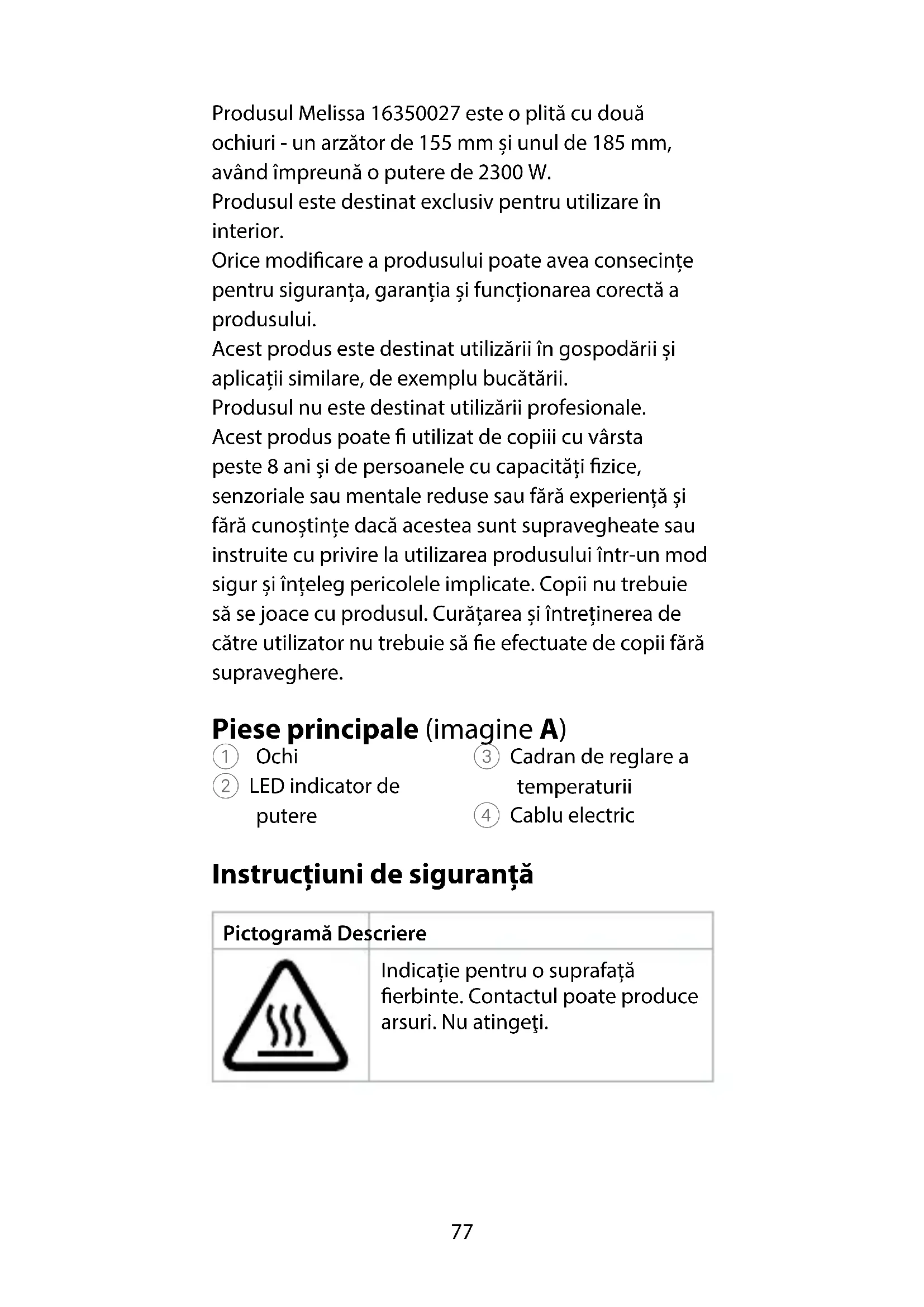 Ghid rapid de inițiere Plită cu două ochiuri 16350027Pentru informații suplimentare, consultați manualul extins, disponibil online. Utilizare preconizată77 Produsul Melissa 16350027 este o plită cu două ochiuri - un arzător de 155 mm și unul de 185 mm, având împreună o putere de 2300 W. Produsul este destinat exclusiv pentru utilizare în interior. Orice modicare a produsului poate avea consecințe pentru siguranța, garanția și funcționarea corectă a produsului. Acest produs este destinat utilizării în gospodării și aplicații similare, de exemplu bucătării. Produsul nu este destinat utilizării profesionale. Acest produs poate utilizat de copiii cu vârsta peste 8 ani și de persoanele cu capacități zice, senzoriale sau mentale reduse sau fără experiență și fără cunoștințe dacă acestea sunt supravegheate sau instruite cu privire la utilizarea produsului într-un mod sigur și înțeleg pericolele implicate. Copii nu trebuie să se joace cu produsul. Curățarea și întreținerea de către utilizator nu trebuie să e efectuate de copii fără supraveghere. Piese principale (imagine A) 1 Ochi 2 LED indicator de putere 3 Cadran de reglare a temperaturii 4 Cablu electric Instrucțiuni de siguranță Pictogramă Descriere Indicație pentru o suprafață erbinte. Contactul poate produce arsuri. Nu atingeţi.78