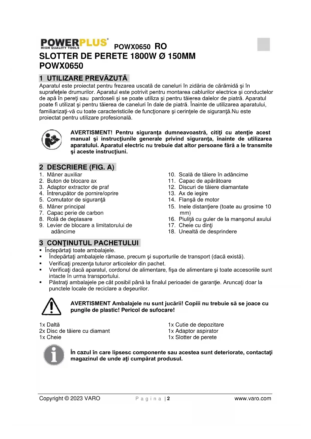 - Scula nedemontată trebuie înapoiată comerciantului într-o stare acceptabilă de curăţenie, (în cutia sa originală dacă e cazul) şi împreună cu dovada cumpărării. 15 MEDIU În cazul în care maşina trebuie înlocuită după utilizare prelungită, nu o aruncaţi laolaltă cu gunoiul menajer, ci eliminaţi-o într-un mod sigur pentru mediu. Deşeurile electrice nu trebuie aruncate la gunoiul menajer. Reciclaţi atunci când există această posibilitate. Pentru recomandări privind reciclarea, consultaţi autorităţile locale sau magazinul de achiziţie.POWX0650 RO Copyright © 2023 VARO P a g i n a | 11 www.varo.com