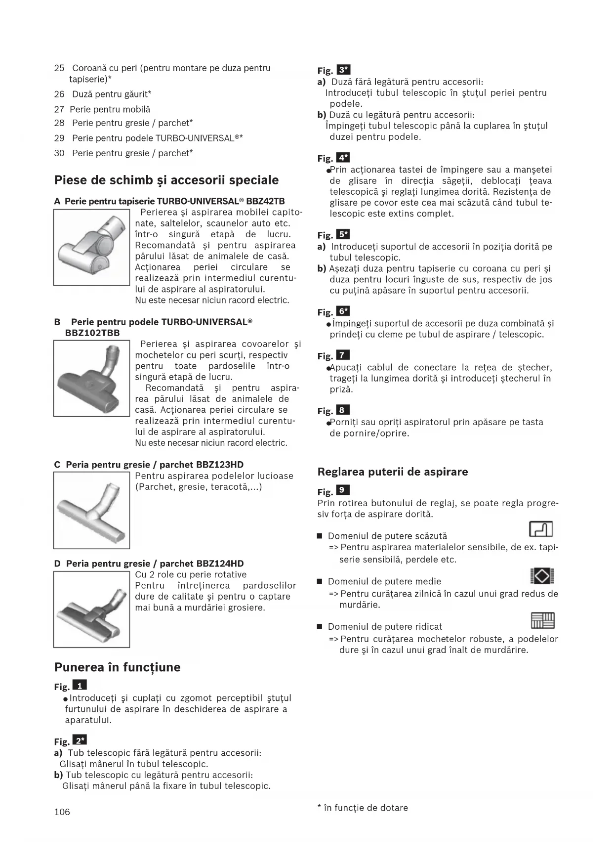 - în funcţie de dotare106 25 Coroană cu peri (pentru montare pe duza pentru tapiserie)* 26 Duză pentru găurit* 27 Perie pentru mobilă 28 Perie pentru gresie / parchet* 29 Perie pentru podele TURBO-UNIVERSAL®* 30 Perie pentru gresie / parchet* Piese de schimb şi accesorii speciale A Perie pentru tapiserie TURBO-UNIVERSAL® BBZ42TB Perierea şi aspirarea mobilei capito- nate, saltelelor, scaunelor auto etc. într-o singură etapă de lucru. Recomandată şi pentru aspirarea părului lăsat de animalele de casă. Acţionarea periei circulare se realizează prin intermediul curentu- lui de aspirare al aspiratorului. Nu este necesar niciun racord electric. B Perie pentru podele TURBO-UNIVERSAL® BBZ102TBB Perierea şi aspirarea covoarelor şi mochetelor cu peri scurţi, respectiv pentru toate pardoselile într-o singură etapă de lucru. Recomandată şi pentru aspira- rea părului lăsat de animalele de casă. Acţionarea periei circulare se realizează prin intermediul curentu- lui de aspirare al aspiratorului. Nu este necesar niciun racord electric. C Peria pentru gresie / parchet BBZ123HD Pentru aspirarea podelelor lucioase (Parchet, gresie, teracotă,...) D Peria pentru gresie / parchet BBZ124HD