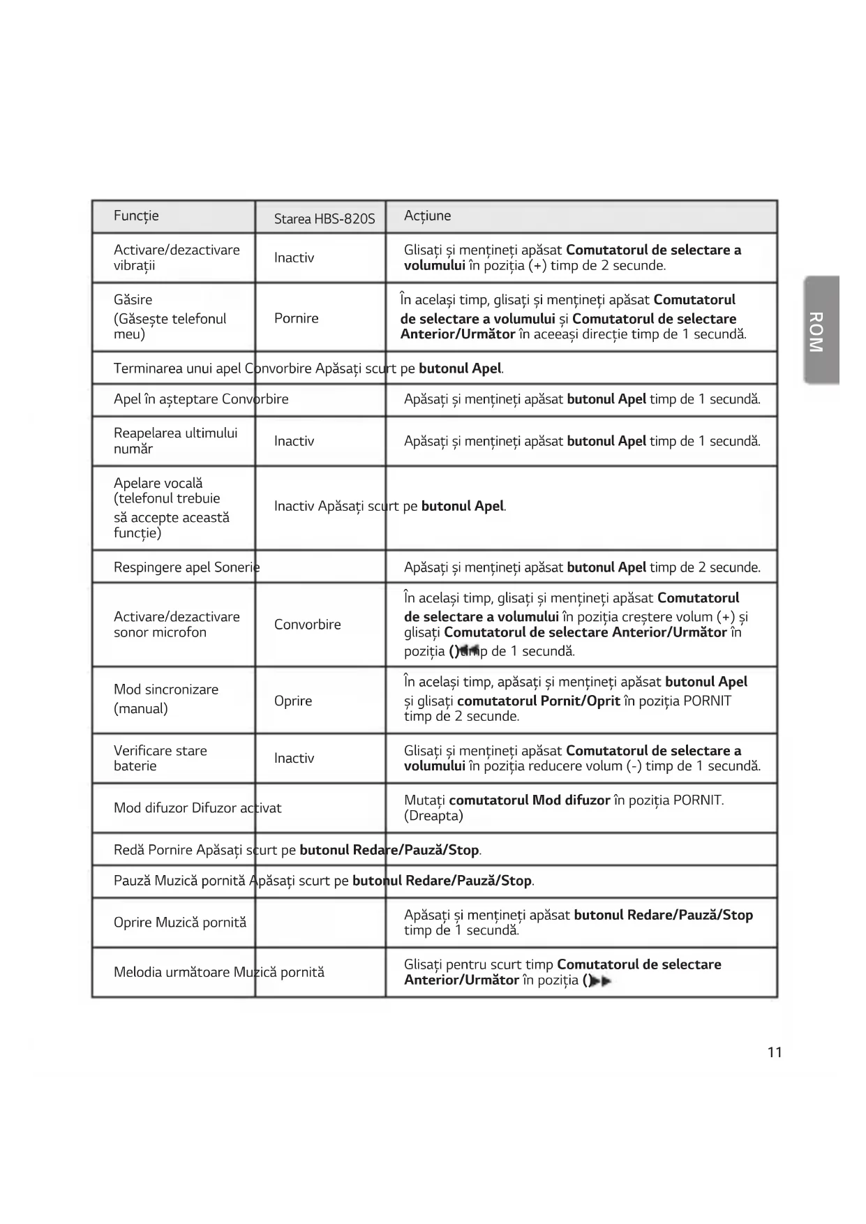 unui apel Sonerie Comutatorul de selectare a volumului11 ROM ROM Funcţie Starea HBS-820S Acţiune Activare/dezactivare vibraţii Inactiv Glisaţi şi menţineţi apăsat Comutatorul de selectare a volumului în poziţia (+) timp de 2 secunde. Găsire (Găseşte telefonul meu) Pornire În acelaşi timp, glisaţi şi menţineţi apăsat Comutatorul de selectare a volumului şi Comutatorul de selectare Anterior/Următor în aceeaşi direcţie timp de 1 secundă. Terminarea unui apel Convorbire Apăsaţi scurt pe butonul Apel. Apel în aşteptare Convorbire Apăsaţi şi menţineţi apăsat butonul Apel timp de 1 secundă. Reapelarea ultimului număr Inactiv Apăsaţi şi menţineţi apăsat butonul Apel timp de 1 secundă. Apelare vocală (telefonul trebuie să accepte această funcţie) Inactiv Apăsaţi scurt pe butonul Apel. Respingere apel Sonerie Apăsaţi şi menţineţi apăsat butonul Apel timp de 2 secunde. Activare/dezactivare sonor microfon Convorbire În acelaşi timp, glisaţi şi menţineţi apăsat Comutatorul de selectare a volumului în poziţia creştere volum (+) şi glisaţi Comutatorul de selectare Anterior/Următor în poziţia ( )timp de 1 secundă. Mod sincronizare (manual) Oprire În acelaşi timp, apăsaţi şi menţineţi apăsat butonul Apel şi glisaţi comutatorul Pornit/Oprit în poziţia PORNIT timp de 2 secunde. Verificare stare baterie Inactiv Glisaţi şi menţineţi apăsat Comutatorul de selectare a volumului în poziţia reducere volum (-) timp de 1 secundă. Mod difuzor Difuzor activat Mutaţi comutatorul Mod difuzor în poziţia PORNIT. (Dreapta) Redă Pornire Apăsaţi scurt pe butonul Redare/Pauză/Stop. Pauză Muzică pornită Apăsaţi scurt pe butonul Redare/Pauză/Stop. Oprire Muzică pornită Apăsaţi şi menţineţi apăsat butonul Redare/Pauză/Stop timp de 1 secundă. Melodia următoare Muzică pornită Glisaţi pentru scurt timp Comutatorul de selectare Anterior/Următor în poziţia ( ).12 ROM ROM Funcţie Starea HBS-820S Acţiune Melodia anterioară Muzică pornită Glisaţi pentru scurt timp Comutatorul de selectare Anterior/Următor în poziţia ( ). Derulare rapidă înainte Muzică pornită Glisaţi şi menţineţi apăsat Comutatorul de selectare Anterior/Următor în poziţia ( ). Derulare înapoi Muzică pornită Glisaţi şi menţineţi apăsat Comutatorul de selectare Anterior/Următor în poziţia ( ). Depanare Probleme Soluţii Alimentarea nu porneşte Verificaţi nivelul bateriei şi încărcaţi-o. Nu se pot efectua apeluri cu HBS-820S Dacă telefonul mobil nu acceptă funcţiile căşti şi handsfree, nu puteţi utiliza caracteristicile de apelare. Verificaţi nivelul bateriei şi încărcaţi-o. HBS-820S nu se poate înregistra pe telefonul mobil Verificaţi dacă dispozitivul HBS-820S este pornit. Verificaţi dacă dispozitivul HBS-820S este în modul Căutare. - În acelaşi timp, apăsaţi şi menţineţi apăsat butonul Apel şi glisaţi comutatorul Pornit/Oprit în poziţia PORNIT, iar HBS-820S trece în modul Căutare. Sunetul este scăzut Controlaţi nivelul sunetului dispozitivului conectat la HBS-820S.13 ROM ROM Specificaţii şi caracteristici Element Comentarii Specificaţii Bluetooth V 4.1 (Căşti/Hands-Free/A2DP/AVRCP) Bateria Baterie de 3,7 V / 210 mAh, polimer litiu-ion Durată în aşteptare Până la 720 ore* Durată convorbiri Până la 14,5 ore* (În modul Difuzor: 8,5 ore) Durată de redare a muzicii Până la 11,5 ore* (În modul Difuzor: 6 ore) Timp de încărcare Aproximativ 2 ore Tensiune de intrare nominală c.c. 4,75 V ~ 5,3 V, 400 mA Temperatură de funcţionare -10 °C (+14 °F) ~ +50 °C (+122 °F) Dimensiuni/Greutate 155,5 mm (l) X 167,5 mm (L) X 17,5 mm (H) / 49,5 g Frecvenţă de funcţionare de la 2.402 MHz până la 2.480 MHz Alimentare nominală 10 dBm *Este posibil ca anumite caracteristici să utilizeze mai multă energie şi să provoace varierea duratei reale.14 ROM ROM Declaraţie de conformitate NOTĂ FCC PENTRU UTILIZATORI: Acest dispozitiv este conform cu Partea 15 din Regulile FCC. Funcţionarea este supusă următoarelor două condiţii: (1) Acest dispozitiv nu cauzează interferenţe dăunătoare şi (2) Acest dispozitiv trebuie să accepte eventualele interferenţe recepţionate, inclusiv pe cele care pot genera o funcţionare nedorită. NOTĂ IMPORTANTĂ: Pentru a îndeplini cerinţele de conformitate cu Regulile FCC referitoare la expunerea la radiofrecvenţe, nu este permisă nicio modificare adusă antenei sau dispozitivului. Orice modificare adusă antenei sau dispozitivului poate genera depăşirea cerinţelor referitoare la expunerea la radiofrecvenţe şi poate anula autoritatea utilizatorului de a opera dispozitivul. DECLARAŢIE DE CONFORMITATE: Prin prezenta, LG Electronics declară că produsul HBS-820S este în conformitate cu cerinţele esenţiale şi alte prevederi relevante ale Directivei 2014/53/EU. O copie a Declaraţiei de conformitate poate fi găsită la http://www.lg.com/global/declaration Bluetooth® este o marcă comercială înregistrată a Bluetooth SIG, Inc. la nivel global. Qualcomm® aptX™ audio este un produs al Qualcomm Technologies International, Ltd.
