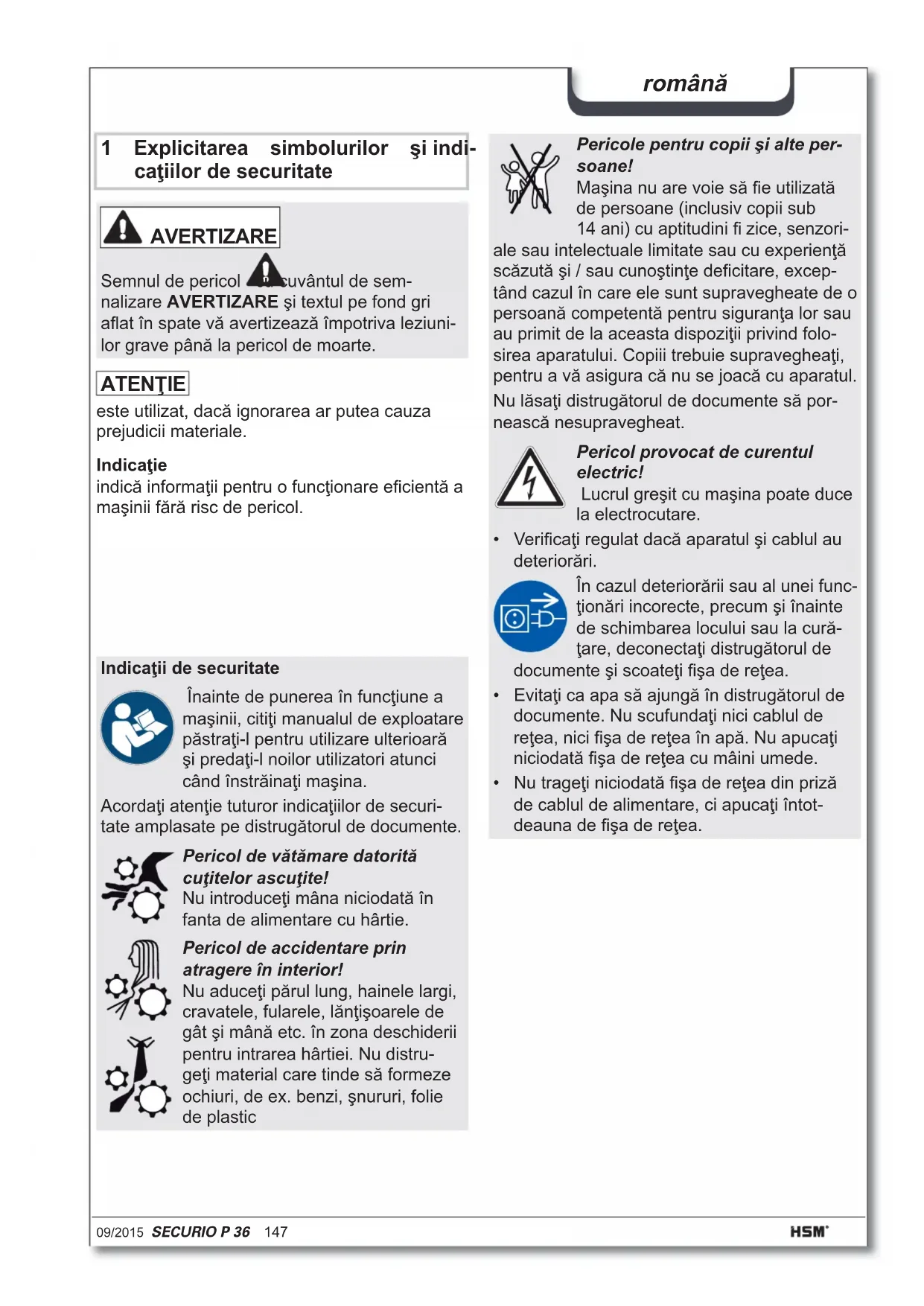 - Az egy menetben vágni kívánt, hosszanti irányban bevezetett lapok (DIN A4, 70 g/m², ill. 80 g/m²) maximális száma. A megadott teljesítményadatok meghatározása új, olajozott vágómű és hideg motor mellett történik. A megadottnál alacsonyabb hálózati feszültség vagy eltérő hálózati frekvencia kisebb lapteljesítményt és nagyobb működési zajt okozhat. A papír minőségétől és tulajdonságaitól, valamint a bevezetés jellegétől függően a lapteljesítmény eltérhet.09/2015 SECURIO P 36 147 română 1 Explicitarea simbolurilor şi indi- caţiilor de securitate Indicaţie indică informaţii pentru o funcţionare efi cientă a maşinii fără risc de pericol. AVERTIZARE Semnul de pericol cu cuvântul de sem- nalizare AVERTIZARE şi textul pe fond gri afl at în spate vă avertizează împotriva leziuni- lor grave până la pericol de moarte. Indicaţii de securitate Înainte de punerea în funcţiune a maşinii, citiţi manualul de exploatare păstraţi-l pentru utilizare ulterioară şi predaţi-l noilor utilizatori atunci când înstrăinaţi maşina. Acordaţi atenţie tuturor indicaţiilor de securi- tate amplasate pe distrugătorul de documente. Pericol de vătămare datorită cuţitelor ascuţite! Nu introduceţi mâna niciodată în fanta de alimentare cu hârtie. Pericol de accidentare prin atragere în interior! Nu aduceţi părul lung, hainele largi, cravatele, fularele, lănţişoarele de gât şi mână etc. în zona deschiderii pentru intrarea hârtiei. Nu distru- geţi material care tinde să formeze ochiuri, de ex. benzi, şnururi, folie de plastic Pericole pentru copii şi alte per- soane! Maşina nu are voie să fi e utilizată de persoane (inclusiv copii sub 14 ani) cu aptitudini fi zice, senzori- ale sau intelectuale limitate sau cu experienţă scăzută şi / sau cunoştinţe defi citare, excep- tând cazul în care ele sunt supravegheate de o persoană competentă pentru siguranţa lor sau au primit de la aceasta dispoziţii privind folo- sirea aparatului. Copiii trebuie supravegheaţi, pentru a vă asigura că nu se joacă cu aparatul. Nu lăsaţi distrugătorul de documente să por- nească nesupravegheat. Pericol provocat de curentul electric! Lucrul greşit cu maşina poate duce la electrocutare.