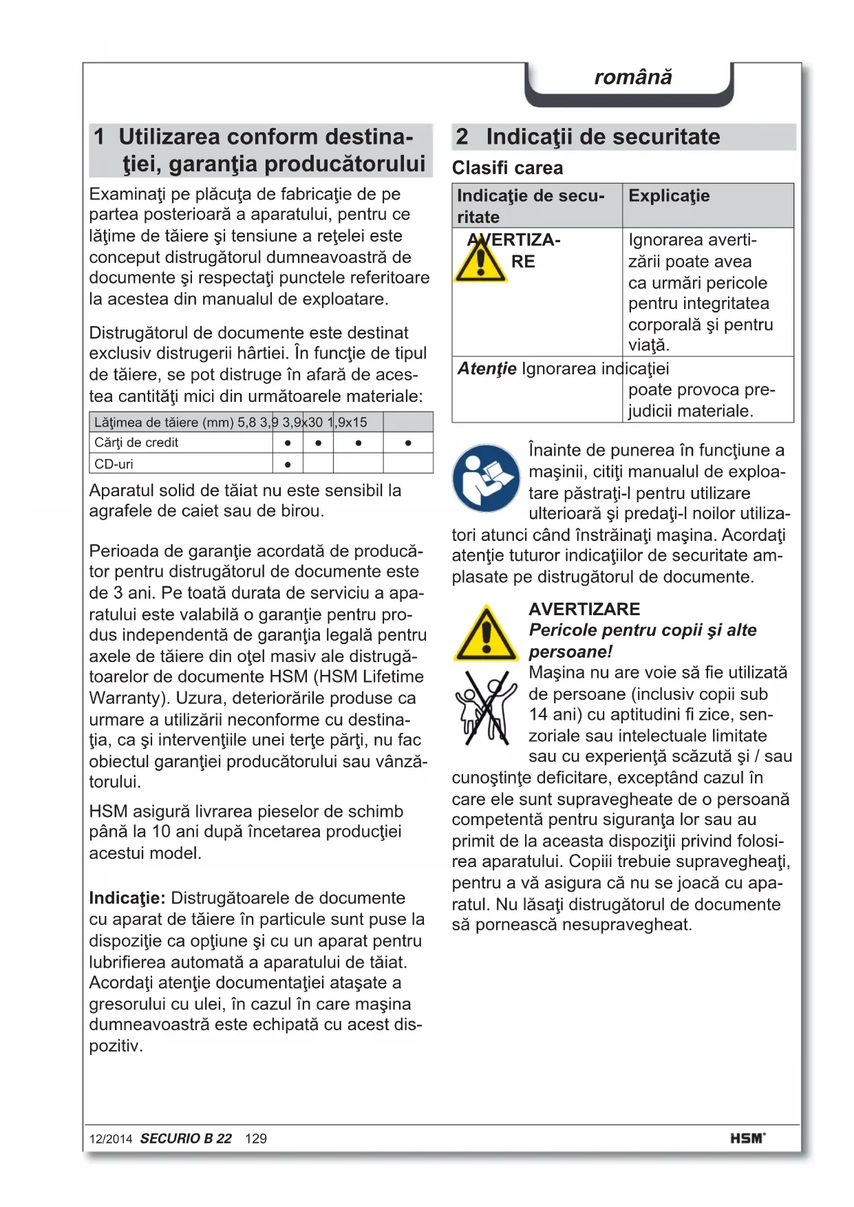 Ignorarea averti- zării poate avea ca urmări pericole pentru integritatea corporală şi pentru viaţă. Atenţie Ignorarea indicaţiei poate provoca pre- judicii materiale. Înainte de punerea în funcţiune a maşinii, citiţi manualul de exploa- tare păstraţi-l pentru utilizare ulterioară şi predaţi-l noilor utiliza- tori atunci când înstrăinaţi maşina. Acordaţi atenţie tuturor indicaţiilor de securitate am- plasate pe distrugătorul de documente. AVERTIZARE Pericole pentru copii şi alte persoane! Maşina nu are voie să fi e utilizată de persoane (inclusiv copii sub 14 ani) cu aptitudini fi zice, sen- zoriale sau intelectuale limitate sau cu experienţă scăzută şi / sau cunoştinţe defi citare, exceptând cazul în care ele sunt supravegheate de o persoană competentă pentru siguranţa lor sau au primit de la aceasta dispoziţii privind folosi- rea aparatului. Copiii trebuie supravegheaţi, pentru a vă asigura că nu se joacă cu apa- ratul. Nu lăsaţi distrugătorul de documente