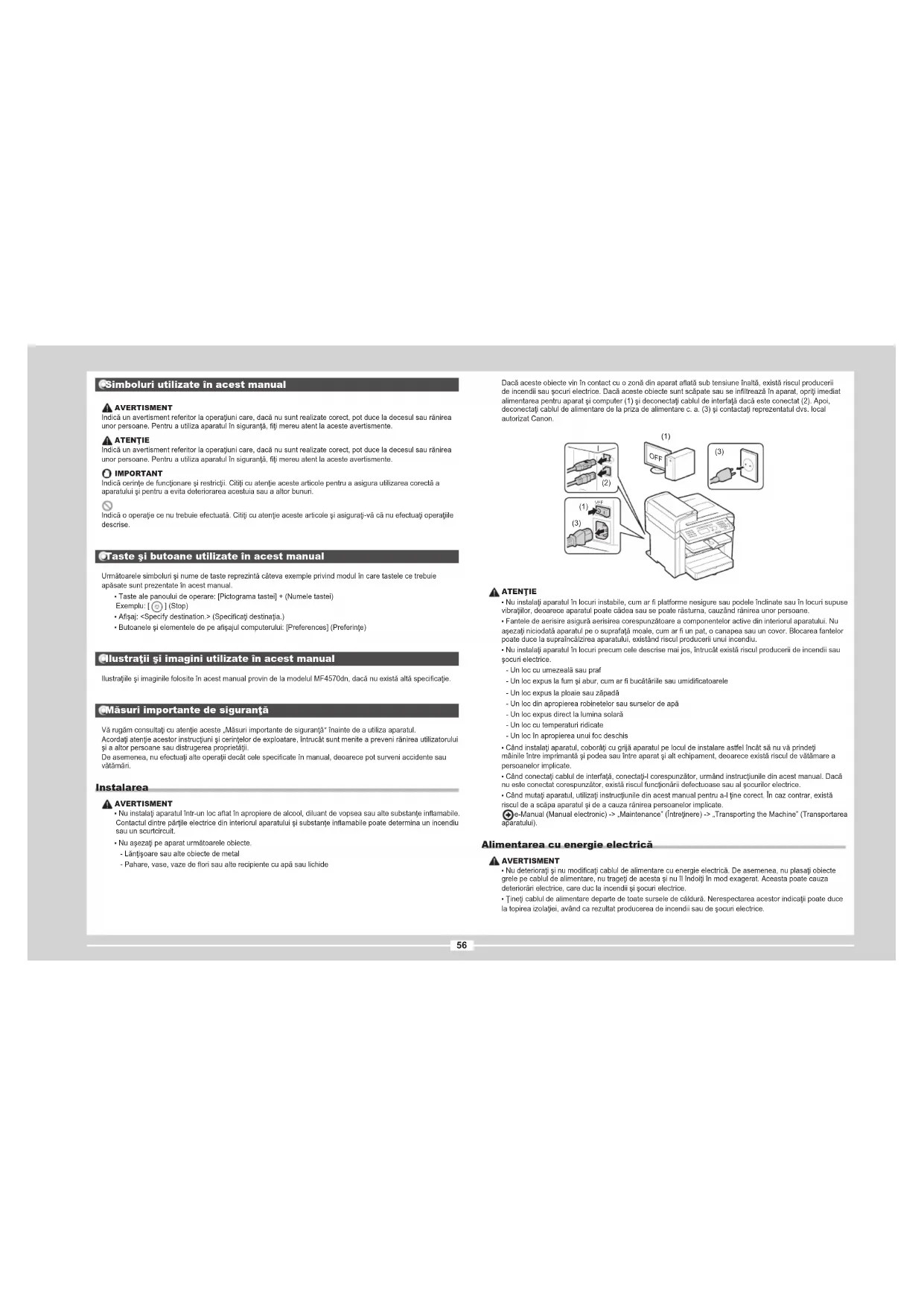 - Butoanele şi elementele de pe aşajul computerului: [Preferences] (Preferinţe) Ilustraţii şi imagini utilizate în acest manual Ilustraţiile şi imaginile folosite în acest manual provin de la modelul MF4570dn, dacă nu există altă specicaţie. Măsuri importante de siguranţă Vă rugăm consultaţi cu atenţie aceste