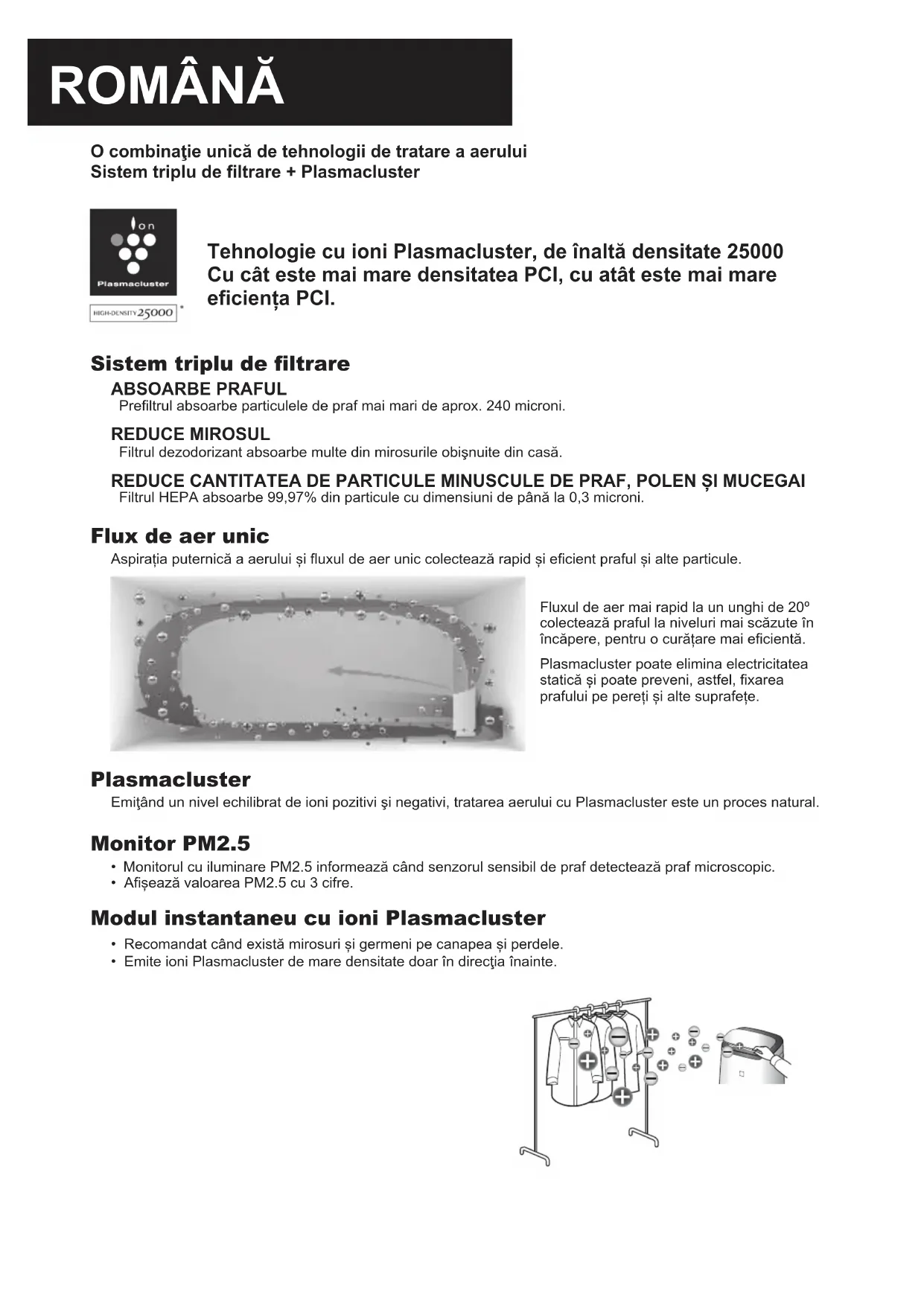 O combinaţie unică de tehnologii de tratare a aerului Sistem triplu de filtrare + Plasmacluster Tehnologie cu ioni Plasmacluster, de înaltă densitate 25000 Cu cât este mai mare densitatea PCI, cu atât este mai mare eficiența PCI. Sistem triplu de filtrare ABSOARBE PRAFUL Prefiltrul absoarbe particulele de praf mai mari de aprox. 240 microni. REDUCE MIROSUL Filtrul dezodorizant absoarbe multe din mirosurile obişnuite din casă. REDUCE CANTITATEA DE PARTICULE MINUSCULE DE PRAF, POLEN ȘI MUCEGAI Filtrul HEPA absoarbe 99,97% din particule cu dimensiuni de până la 0,3 microni. Flux de aer unic Aspirația puternică a aerului și fluxul de aer unic colectează rapid și eficient praful și alte particule.