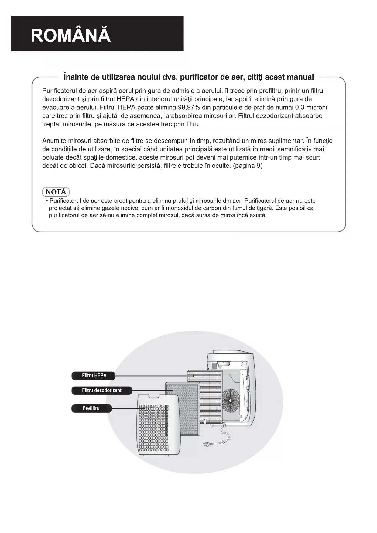 Pre-FilterHEPA FilterDeodorizing Filter Puricatorul de aer aspiră aerul prin gura de admisie a aerului, îl trece prin preltru, printr-un ltru dezodorizant şi prin ltrul HEPA din interiorul unităţii principale, iar apoi îl elimină prin gura de evacuare a aerului. Filtrul HEPA poate elimina 99,97% din particulele de praf de numai 0,3 microni care trec prin ltru şi ajută, de asemenea, la absorbirea mirosurilor. Filtrul dezodorizant absoarbe treptat mirosurile, pe măsură ce acestea trec prin ltru. Anumite mirosuri absorbite de ltre se descompun în timp, rezultând un miros suplimentar. În funcţie de condițiile de utilizare, în special când unitatea principală este utilizată în medii semnicativ mai poluate decât spaţiile domestice, aceste mirosuri pot deveni mai puternice într-un timp mai scurt decât de obicei. Dacă mirosurile persistă, ltrele trebuie înlocuite. (pagina 9) NOTĂ