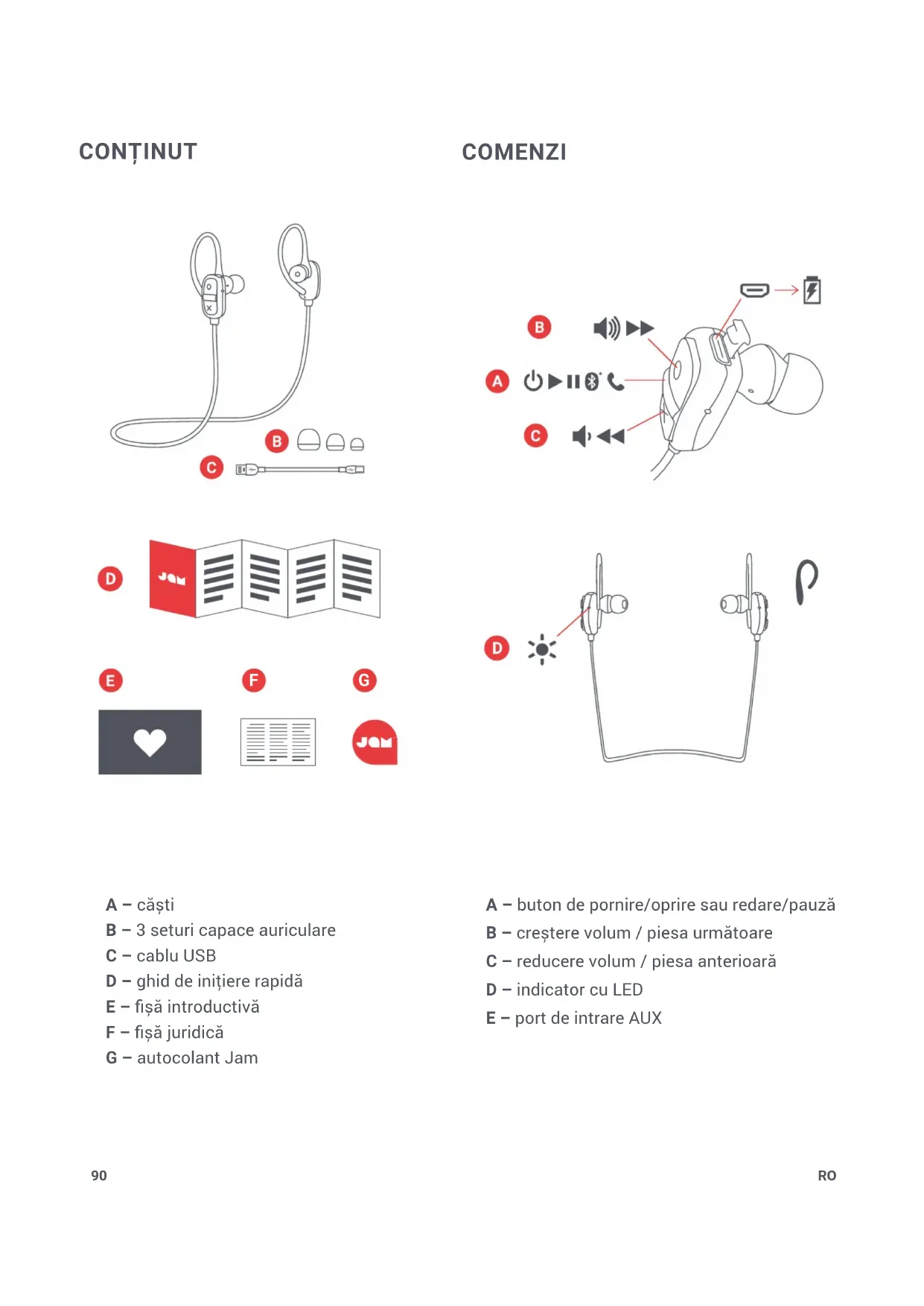 Acest simbol indică faptul că bateriile nu trebuie eliminate în deșeurile casnice, întrucât conţin substanţe ce pot dăunătoare mediului și sănătăţii. Vă rugăm eliminaţi bateriile la punctele de colectare special amenajate. Prin prezenta, FKA Brands Ltd declară că acest dispozitiv radio este în conformitate cu cerinţele esenţiale și cu celelalte prevederi relevante ale Directivei 2014/53/UE. O copie a declaraţiei de conformitate poate obţinută de la adresa uk.jamaudio.com/ DoC. Toate drepturile rezervate. IB-HXEP303DT94 EN 94EN 94 “Live Large” HX-EP303 InstrukcjaPL95 ZAWARTOŚĆ A – słuchawki B – 3 zestawy nakładek dousznych C – Kabel USB D – Skrócona instrukcja obsługi E – Karta powitalna F – Karta z uwagami prawnymi G – Naklejka Jam