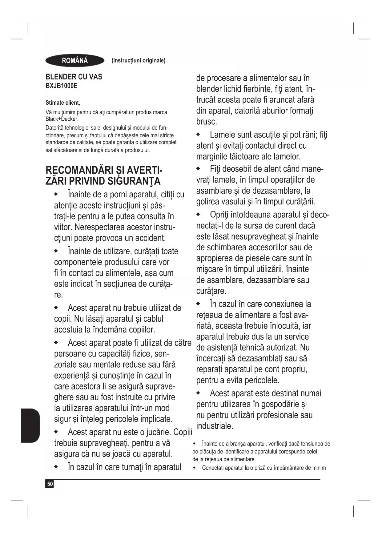 BXJB1000E Stimate client, Vă mulţumim pentru că aţi cumpărat un produs marca Black+Decker. Datorită tehnologiei sale, designului și modului de fun- cționare, precum și faptului că depășește cele mai stricte standarde de calitate, se poate garanta o utilizare complet satisfăcătoare și de lungă durată a produsului.