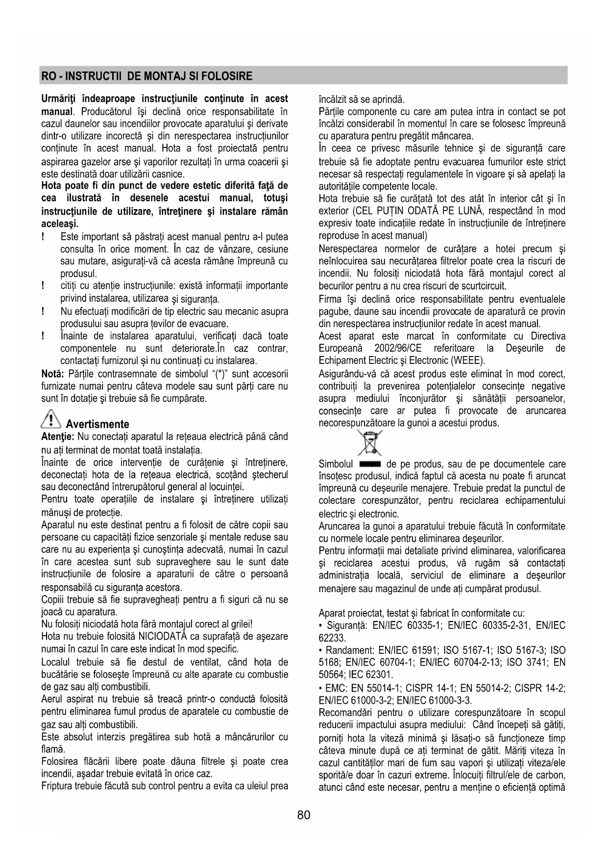 Ако ел. крушките не светят, проверете дали са монтирани правилно преди да потърсите помощта на специалист.80 RO - INSTRUCTII DE MONTAJ SI FOLOSIRE Urmăriţi îndeaproape instrucţiunile conţinute în acest manual. Producătorul îşi declină orice responsabilitate în cazul daunelor sau incendiilor provocate aparatului şi derivate dintr-o utilizare incorectă şi din nerespectarea instrucţiunilor conţinute în acest manual. Hota a fost proiectată pentru aspirarea gazelor arse şi vaporilor rezultaţi în urma coacerii şi este destinată doar utilizării casnice. Hota poate fi din punct de vedere estetic diferită faţă de cea ilustrată în desenele acestui manual, totuşi instrucţiunile de utilizare, întreţinere şi instalare rămân aceleaşi. ! Este important să păstraţi acest manual pentru a-l putea consulta în orice moment. În caz de vânzare, cesiune sau mutare, asiguraţi-vă că acesta rămâne împreună cu produsul. ! citiţi cu atenţie instrucţiunile: există informaţii importante privind instalarea, utilizarea şi siguranţa. ! Nu efectuaţi modificări de tip electric sau mecanic asupra produsului sau asupra ţevilor de evacuare. ! Înainte de instalarea aparatului, verificați dacă toate componentele nu sunt deteriorate.În caz contrar, contactați furnizorul și nu continuați cu instalarea. Notă: Părţile contrasemnate de simbolul “(*)” sunt accesorii furnizate numai pentru câteva modele sau sunt părţi care nu sunt în dotaţie şi trebuie să fie cumpărate. Avertismente Atenţie: Nu conectaţi aparatul la reţeaua electrică până când nu aţi terminat de montat toată instalaţia. Înainte de orice intervenţie de curăţenie şi întreţinere, deconectaţi hota de la reţeaua electrică, scoţând ştecherul sau deconectând întrerupătorul general al locuinţei. Pentru toate operaţiile de instalare şi întreţinere utilizaţi mănuși de protecţie. Aparatul nu este destinat pentru a fi folosit de către copii sau persoane cu capacităţi fizice senzoriale şi mentale reduse sau care nu au experienţa şi cunoştinţa adecvată, numai în cazul în care acestea sunt sub supraveghere sau le sunt date instrucţiunile de folosire a aparaturii de către o persoană responsabilă cu siguranţa acestora. Copiii trebuie să fie supravegheaţi pentru a fi siguri că nu se joacă cu aparatura. Nu folosiţi niciodată hota fără montajul corect al grilei! Hota nu trebuie folosită NICIODATĂ ca suprafaţă de aşezare numai în cazul în care este indicat în mod specific. Localul trebuie să fie destul de ventilat, când hota de bucătărie se foloseşte împreună cu alte aparate cu combustie de gaz sau alţi combustibili. Aerul aspirat nu trebuie să treacă printr-o conductă folosită pentru eliminarea fumul produs de aparatele cu combustie de gaz sau alţi combustibili. Este absolut interzis pregătirea sub hotă a mâncărurilor cu flamă. Folosirea flăcării libere poate dăuna filtrele şi poate crea incendii, aşadar trebuie evitată în orice caz. Friptura trebuie făcută sub control pentru a evita ca uleiul prea încălzit să se aprindă. Părţile componente cu care am putea intra in contact se pot încălzi considerabil în momentul în care se folosesc împreună cu aparatura pentru pregătit mâncarea. În ceea ce privesc măsurile tehnice şi de siguranţă care trebuie să fie adoptate pentru evacuarea fumurilor este strict necesar să respectaţi regulamentele în vigoare şi să apelaţi la autorităţile competente locale. Hota trebuie să fie curăţată tot des atât în interior cât şi în exterior (CEL PUŢIN ODATĂ PE LUNĂ, respectând în mod expresiv toate indicaţiile redate în instrucţiunile de întreţinere reproduse în acest manual) Nerespectarea normelor de curăţare a hotei precum şi neînlocuirea sau necurăţarea filtrelor poate crea la riscuri de incendii. Nu folosiţi niciodată hota fără montajul corect al becurilor pentru a nu crea riscuri de scurtcircuit. Firma îşi declină orice responsabilitate pentru eventualele pagube, daune sau incendii provocate de aparatură ce provin din nerespectarea instrucţiunilor redate în acest manual. Acest aparat este marcat în conformitate cu Directiva Europeană 2002/96/CE referitoare la Deşeurile de Echipament Electric şi Electronic (WEEE). Asigurându-vă că acest produs este eliminat în mod corect, contribuiţi la prevenirea potenţialelor consecinţe negative asupra mediului înconjurător şi sănătăţii persoanelor, consecin ţe care ar putea fi provocate de aruncarea necorespunzătoare la gunoi a acestui produs. Simbolul de pe produs, sau de pe documentele care însoţesc produsul, indică faptul că acesta nu poate fi aruncat împreună cu deşeurile menajere. Trebuie predat la punctul de colectare corespunzător, pentru reciclarea echipamentului electric şi electronic. Aruncarea la gunoi a aparatului trebuie făcută în conformitate cu normele locale pentru eliminarea deşeurilor. Pentru informaţii mai detaliate privind eliminarea, valorificarea şi reciclarea acestui produs, vă rugăm să contactaţi administraţia locală, serviciul de eliminare a deşeurilor menajere sau magazinul de unde aţi cumpărat produsul. Aparat proiectat, testat şi fabricat în conformitate cu: